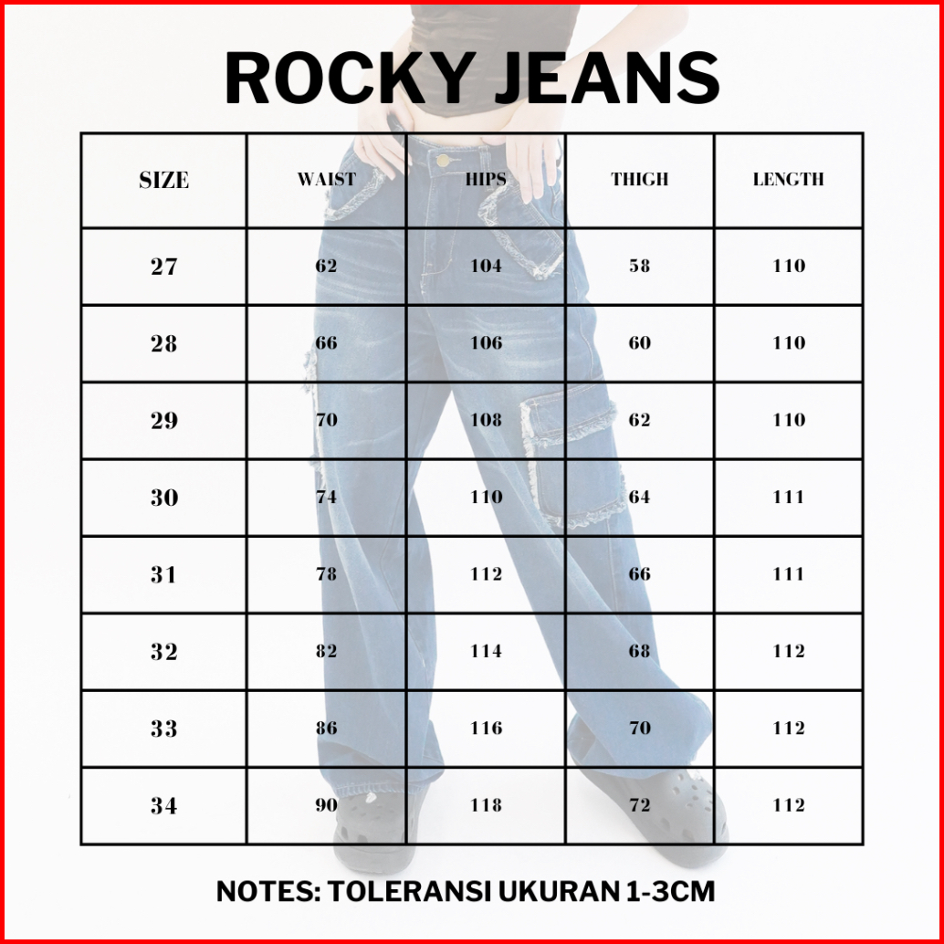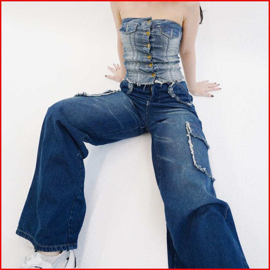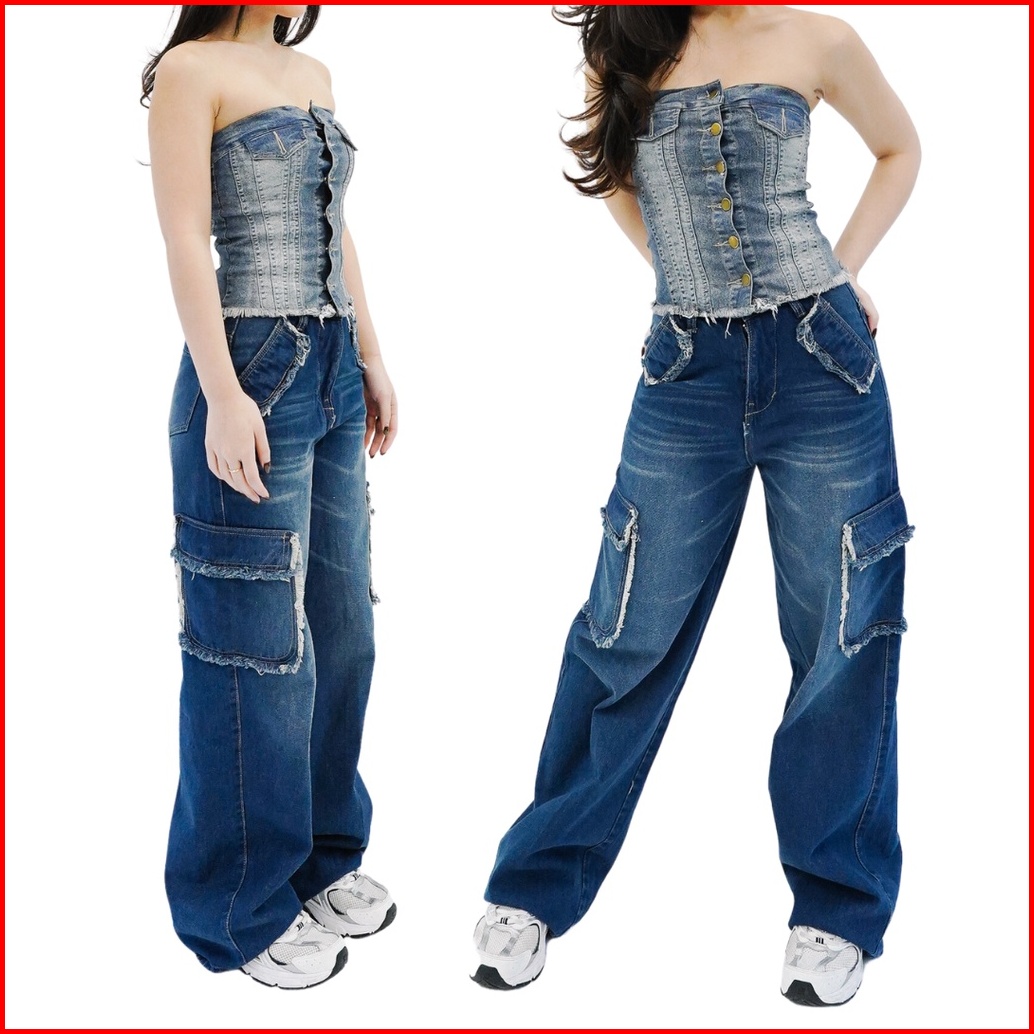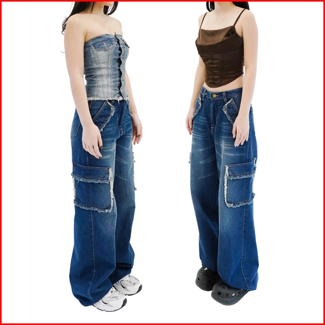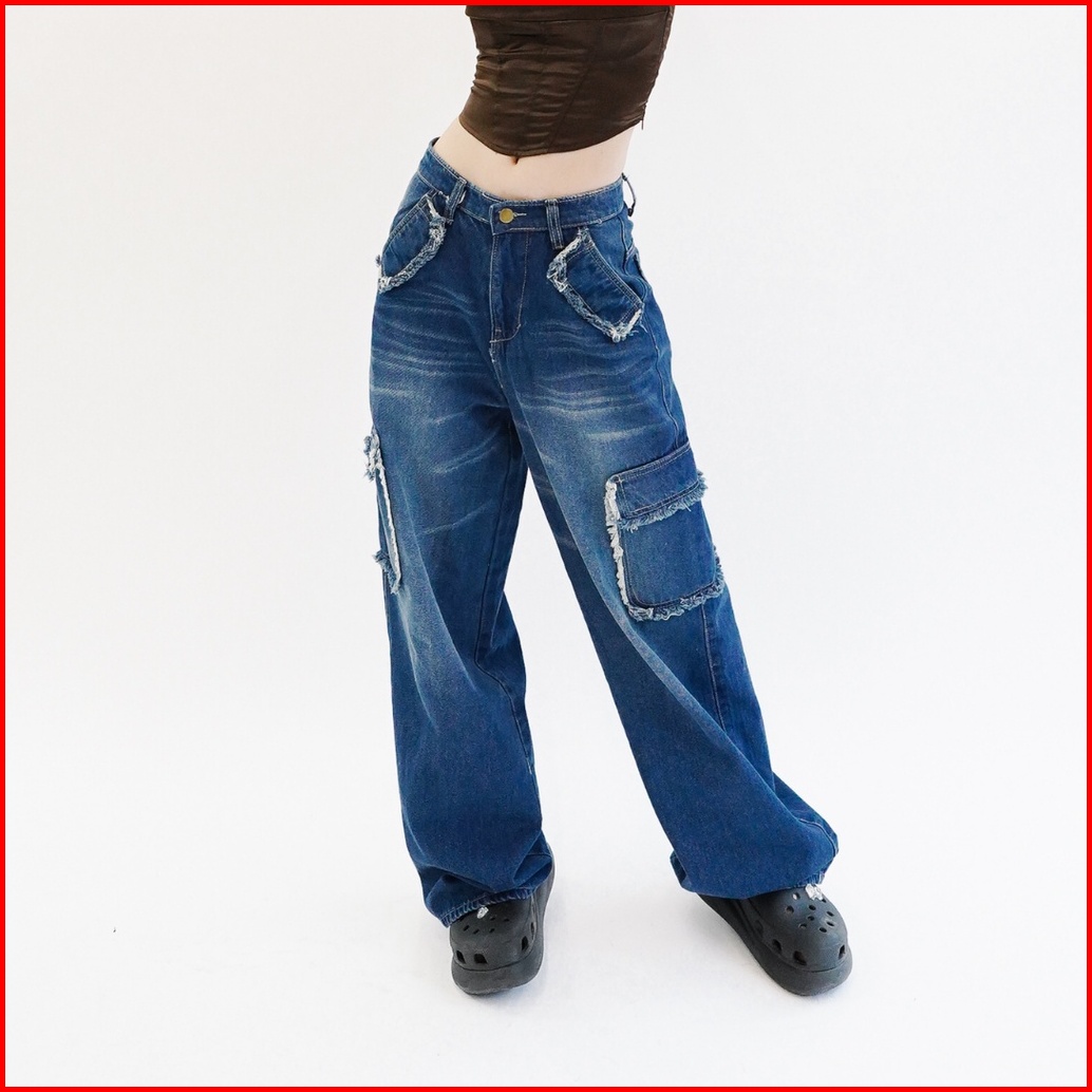 Ladouce - Rocky High Waist Baggy Cargo Jeans Celana Panjang Wanita