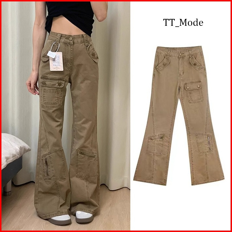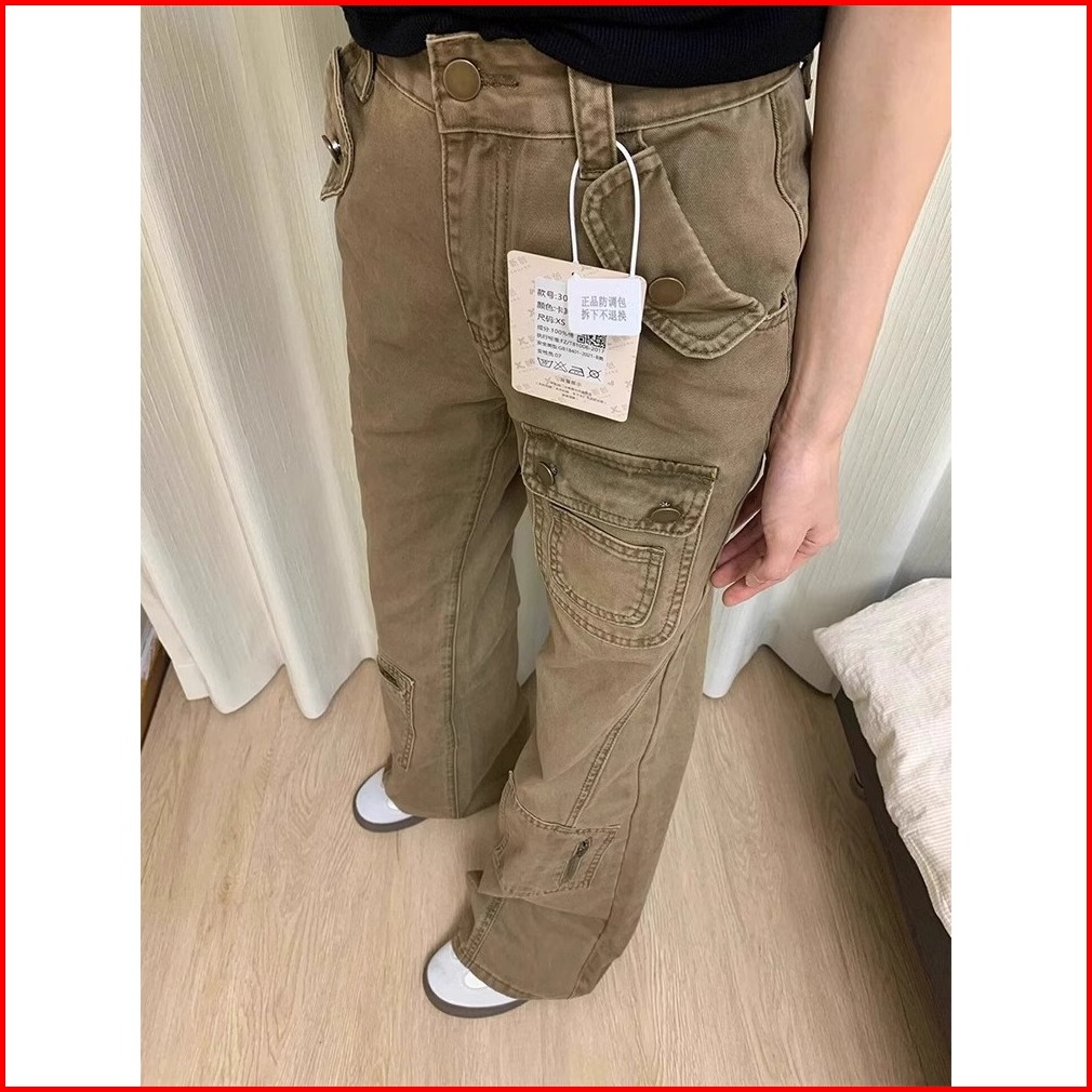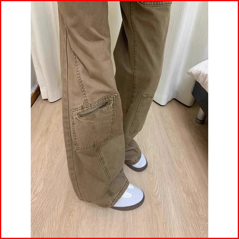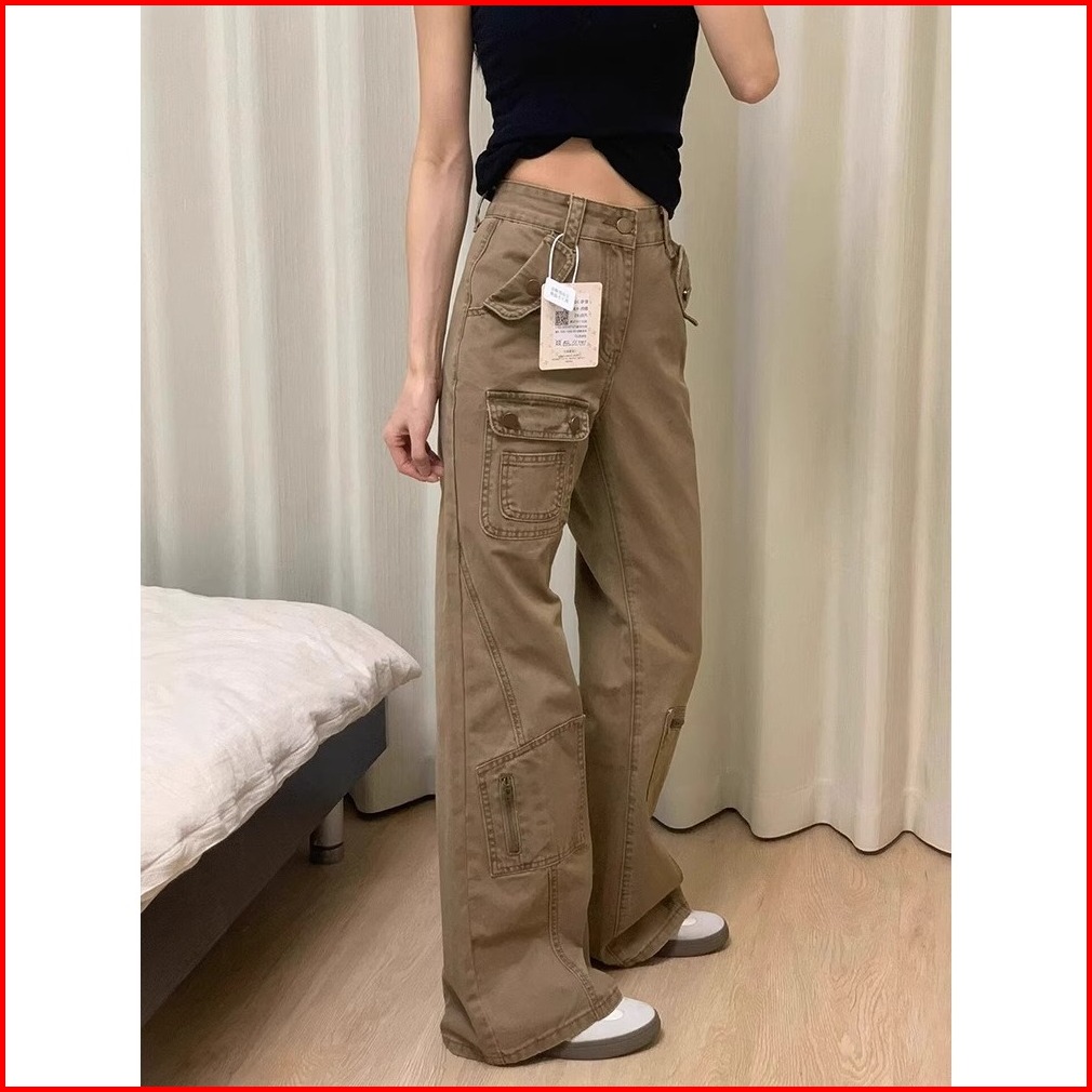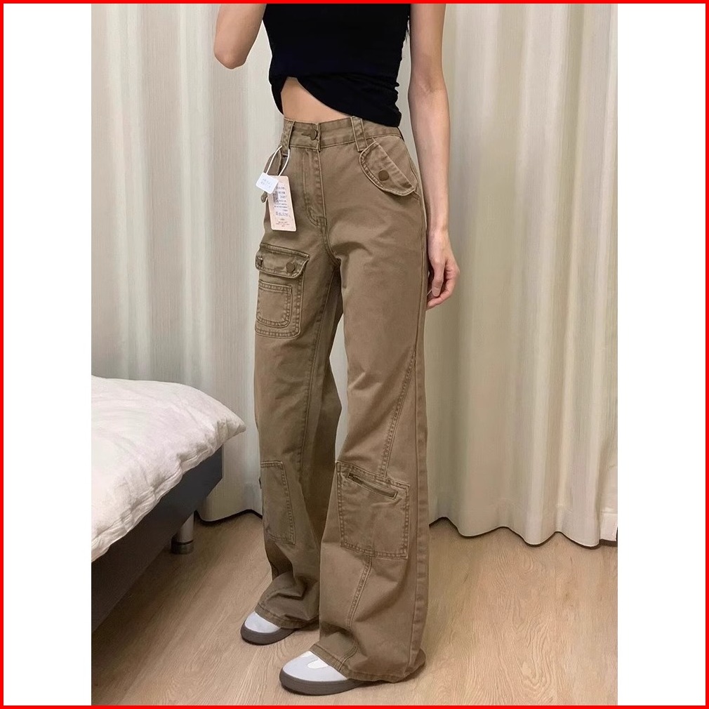 Kekinian Khaki New Denim Cargo Highwaist Kasual Wanita Celana Cargo
