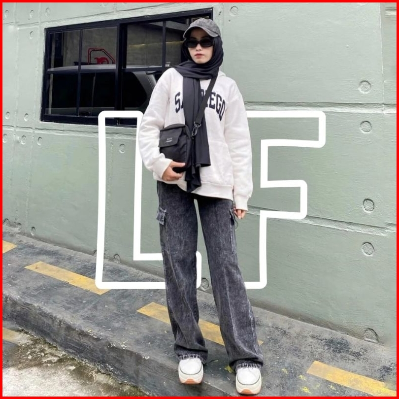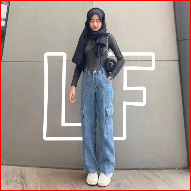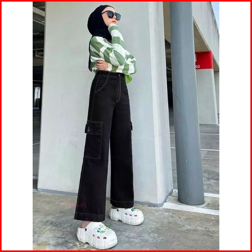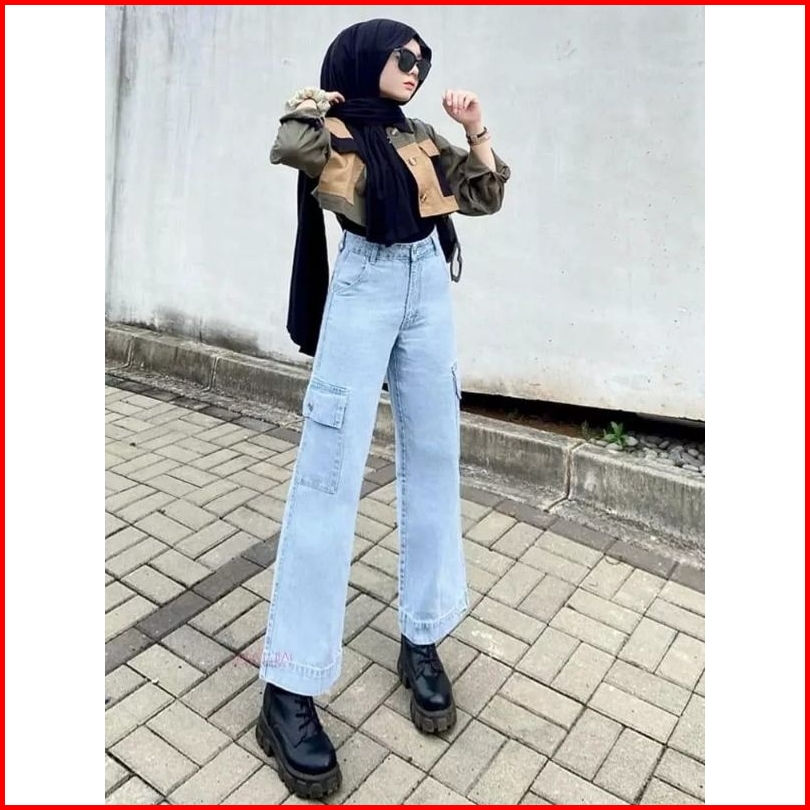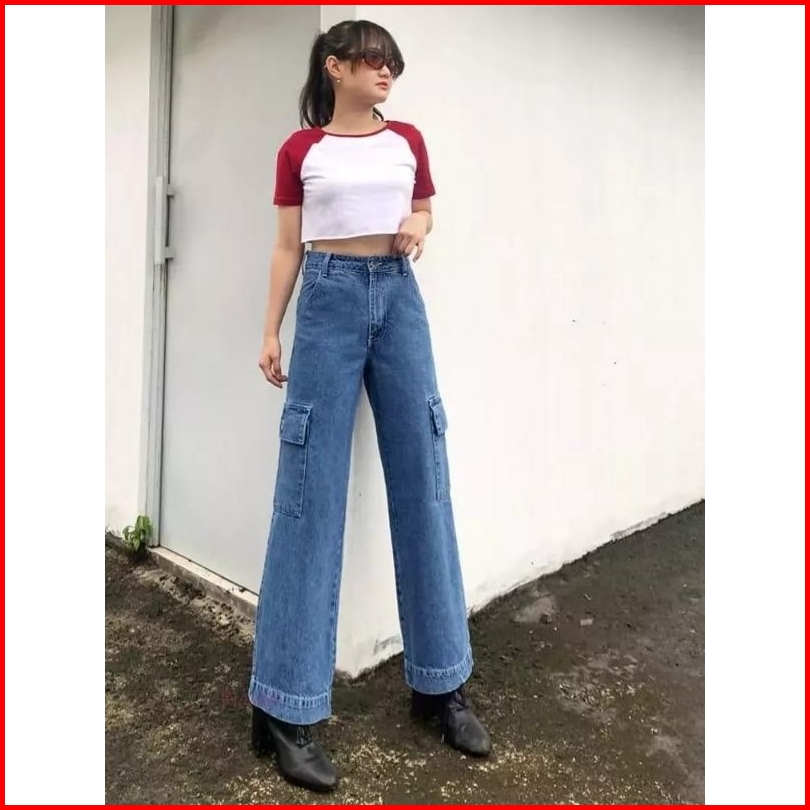 Celana Jeans Cargo Wanita Highwaist Kantong Samping