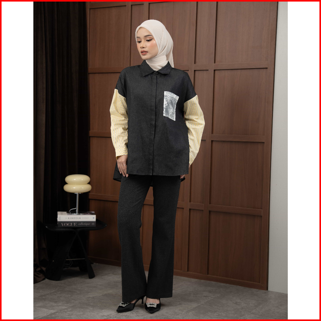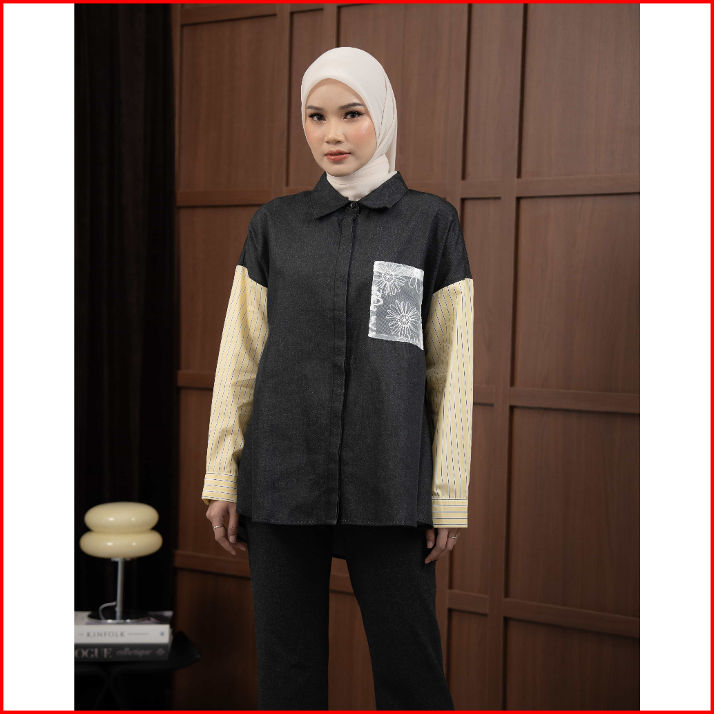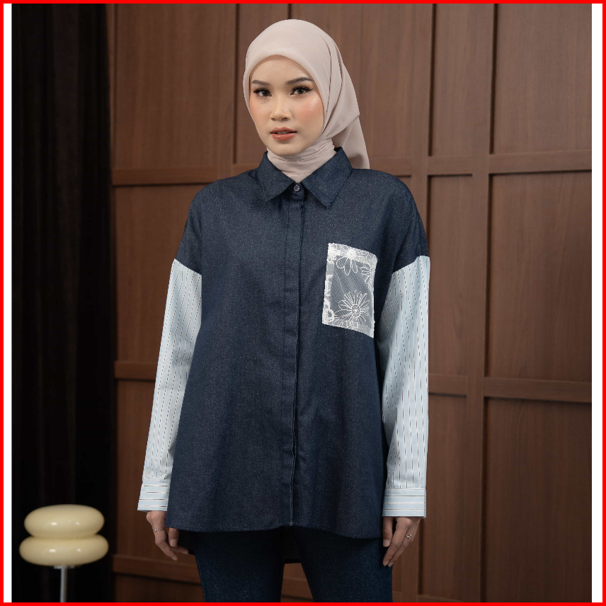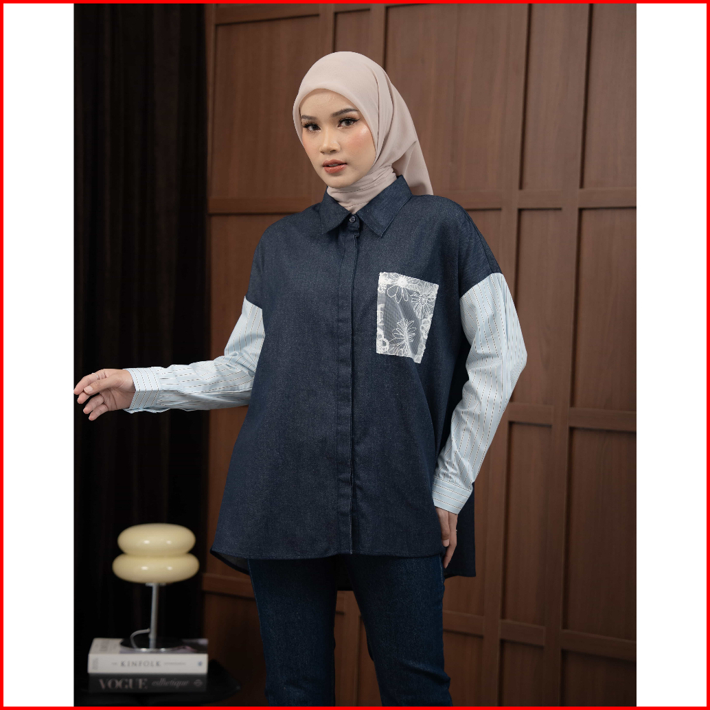 Mayoutfit Elaxy Shirt Kemeja Oversized Denim Wanita Kombi Katun Stripe Aksen Saku Bordir Renda