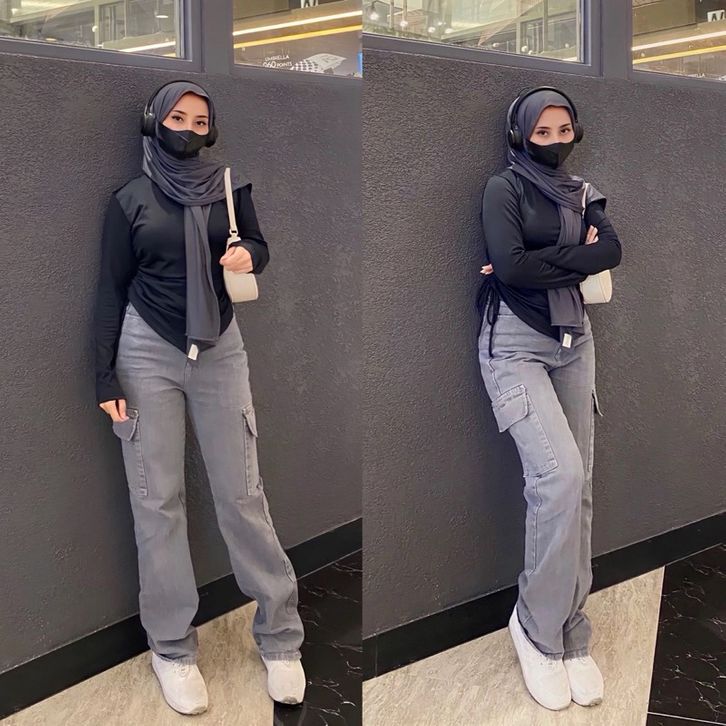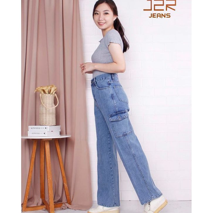 Celana Highwaist Cargo Jeans Panjang Kantong Cewek VOLL 2 Kulot Saku Tempel Depan Berkualitas Premium