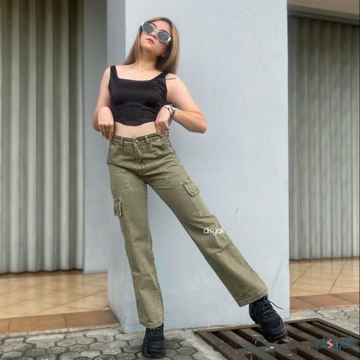 Celana Cargo Jeans Kantong Kimpul Highwaist Kulot Jeans Saku Tempel Depan Berkualitas Premium Tinggi Stylish Kekinian