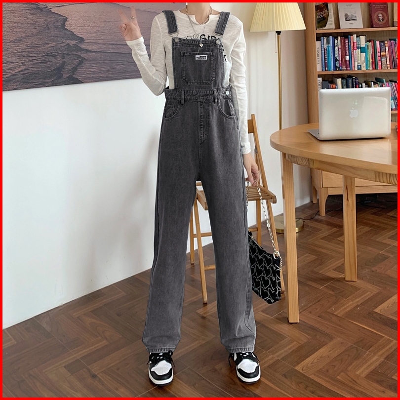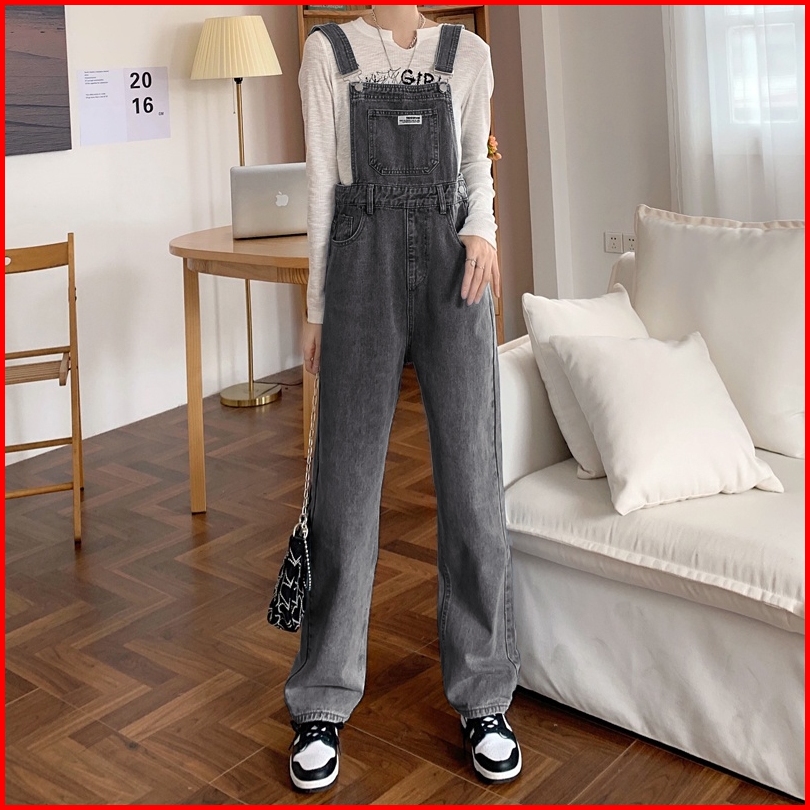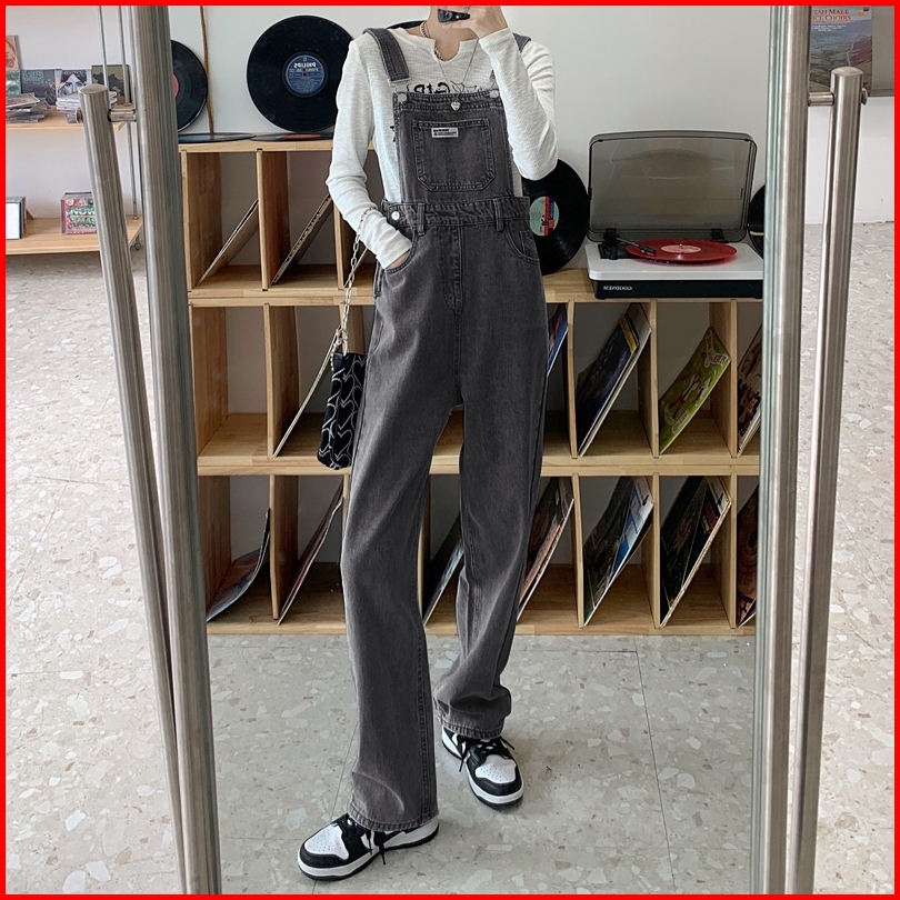 Abu Abu Overall Kaki Lebar Longgar Pinggang Tinggi Gaya Korea Wanita---celana Kodok Jeans Wanita