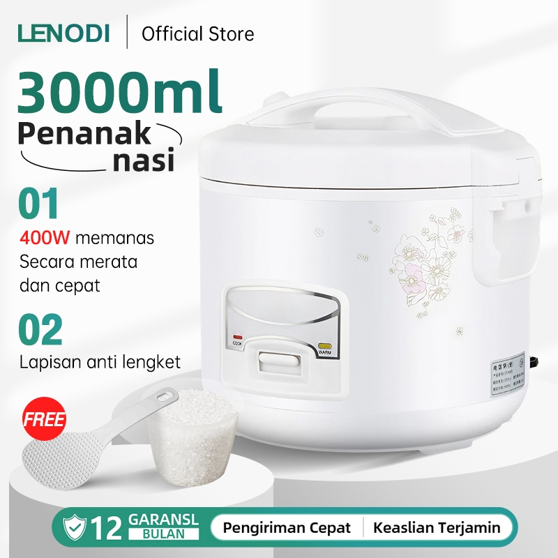 LENODI Penanak Nasi Dapur Rumah Kapasitas 3L Mini Pintar 1-6 Orang Penanak Nasi Anti Lengket Sup Nasi Kukus Tiga Dalam