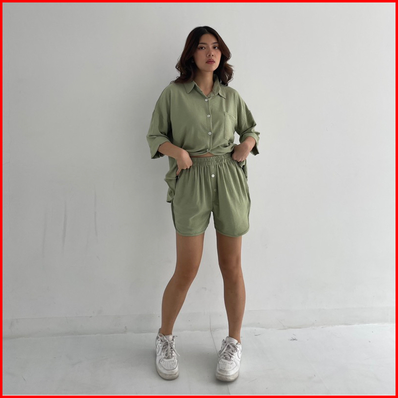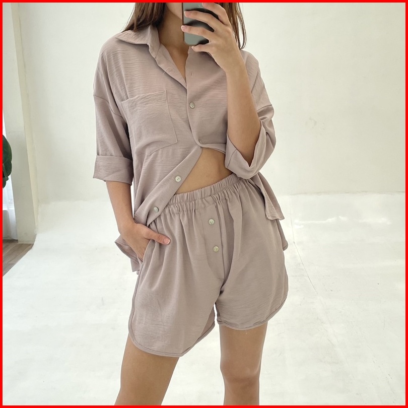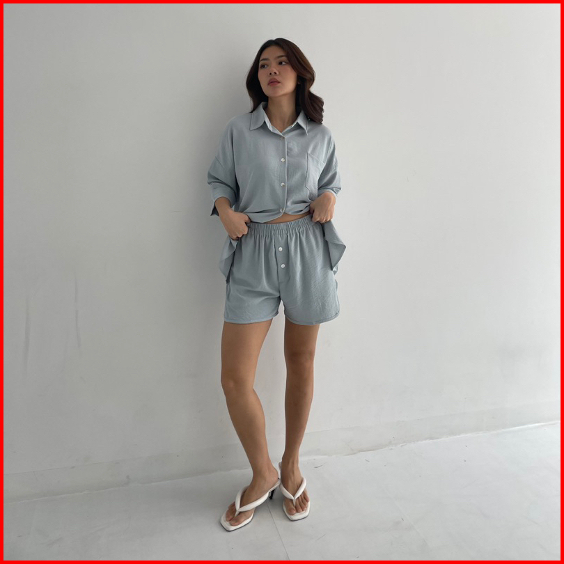 Byeol Set Setelan Wanita Crinkle Kemeja Set Celana Pendek Highwaist Highwaisted Shorts Pants
