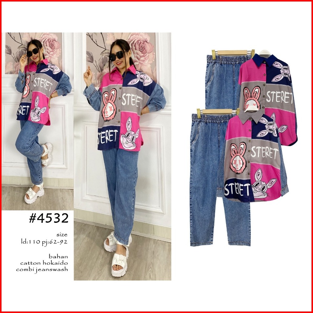 Setcel Wanita Kemeja Motif Rabbit Mix Denim Lengan Panjang One Set Premium Bebefashion.id 4532