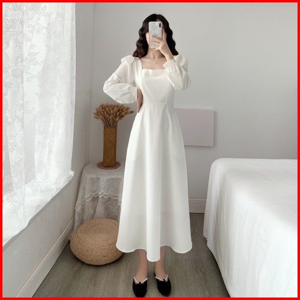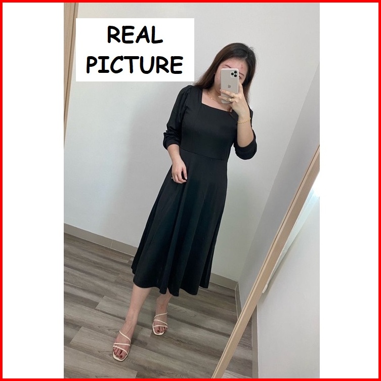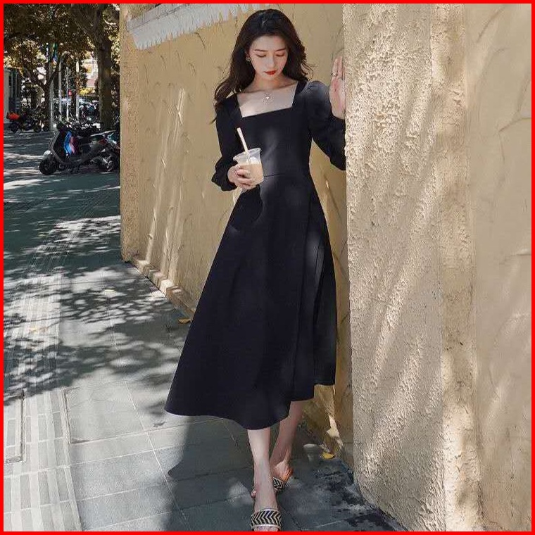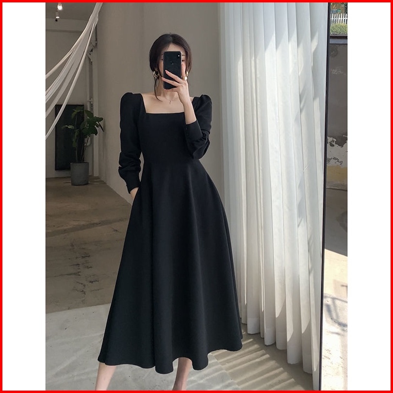 Zlore - Dr05 U Neck Dress Lengan Panjang Korean Party Dress Square Neck - 100 Import S-2xl