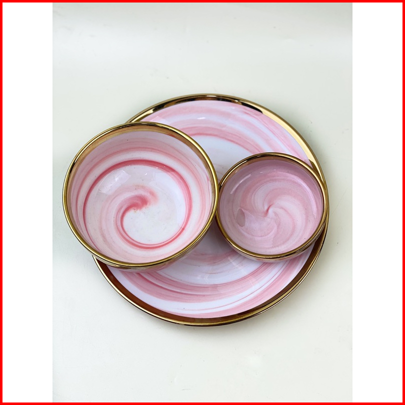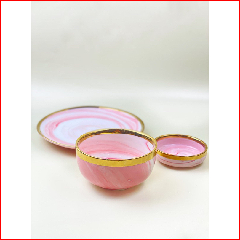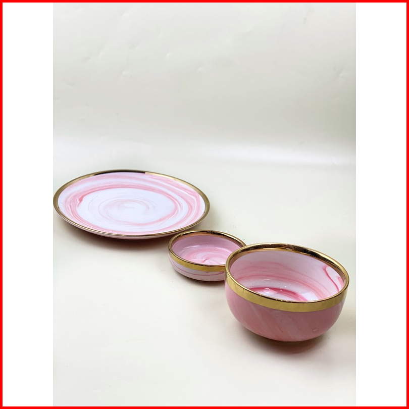 Ashome Piring Set 1 Orang Piring Makan Set Pink Marble Isi 3 Pcs Piring Set Keramik List Piring Set Mewah Piring Sultan
