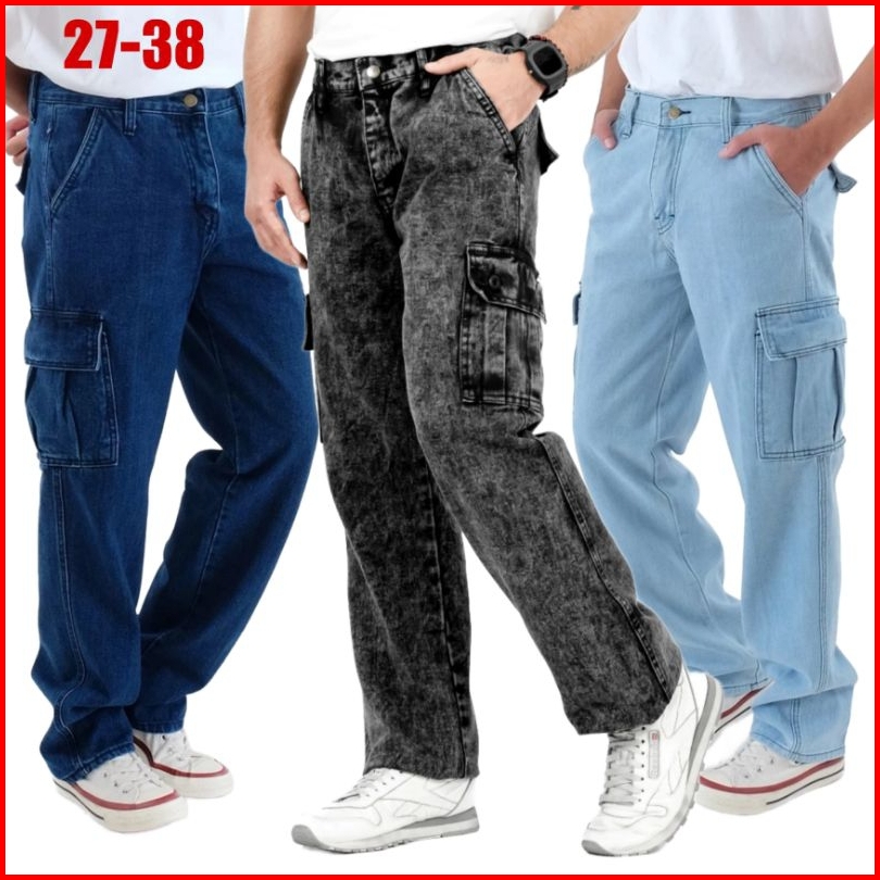 Celana Cargo Jeans Panjang Pria Reguler Standar Loose Fit Cargo Gombrong Jeans Pria Size 27-38 Terbaru