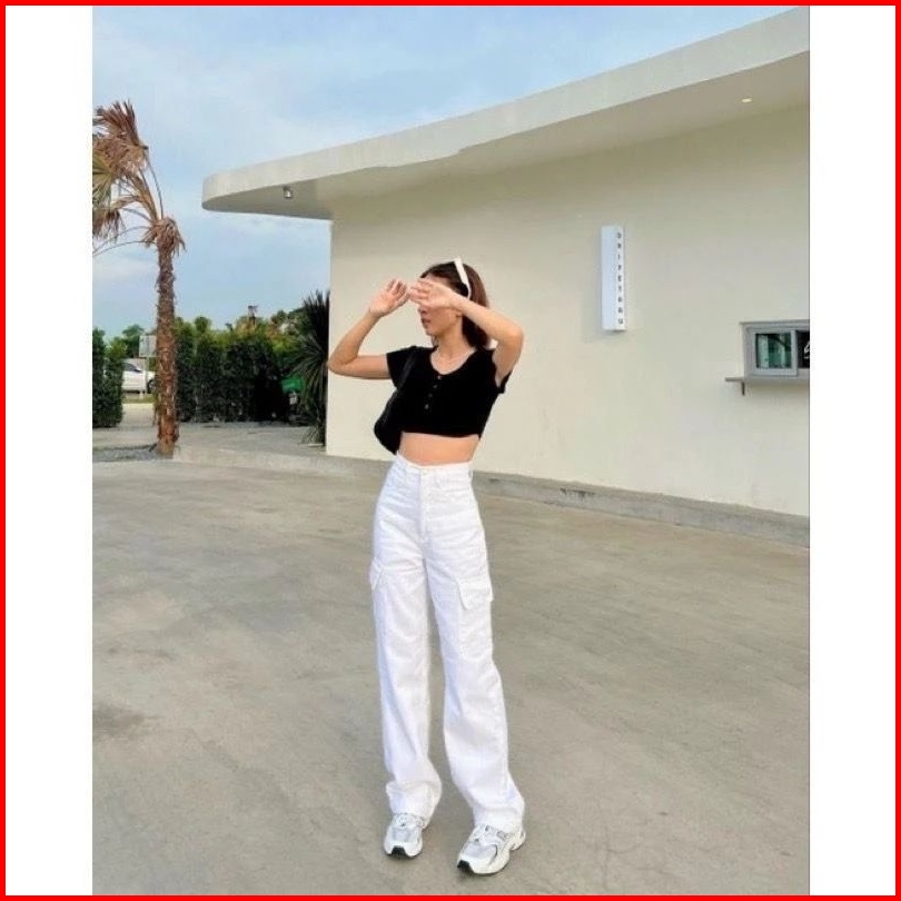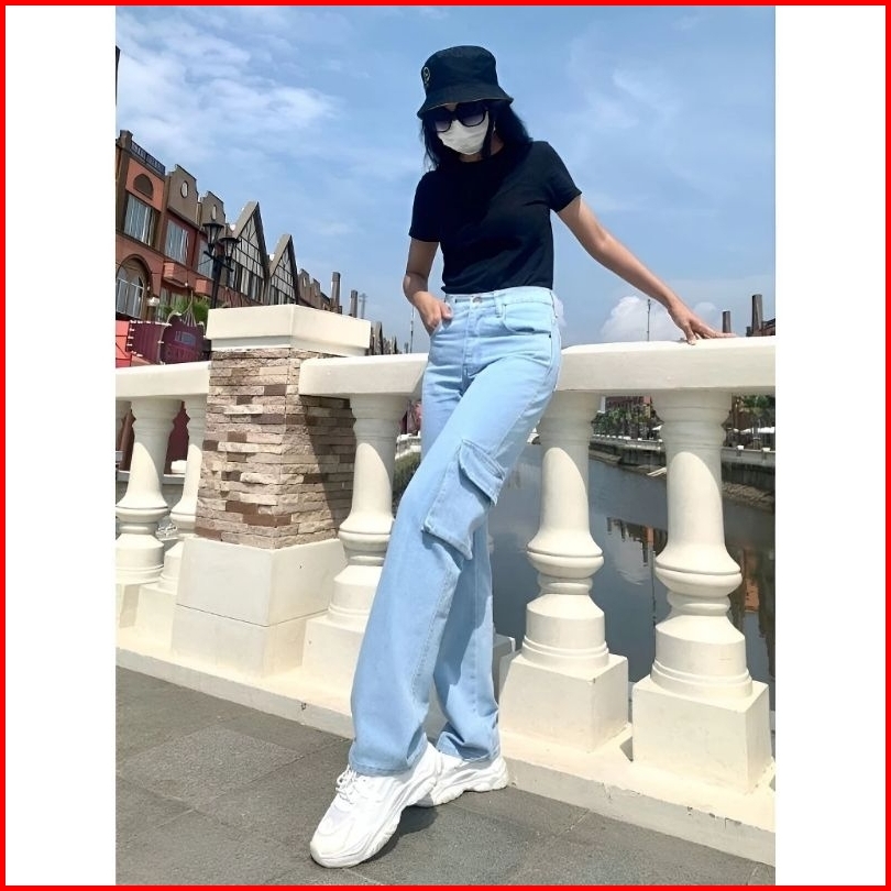 Yma Fashion - Celana Jeans Cargo Wanita - Hightwaist Celana Jeans Cargo