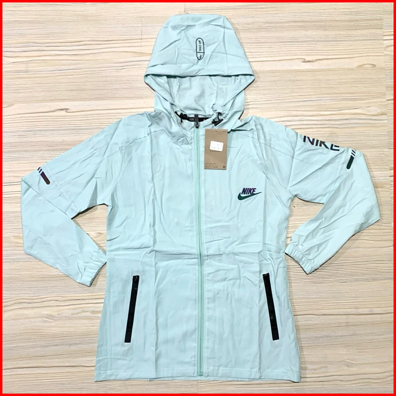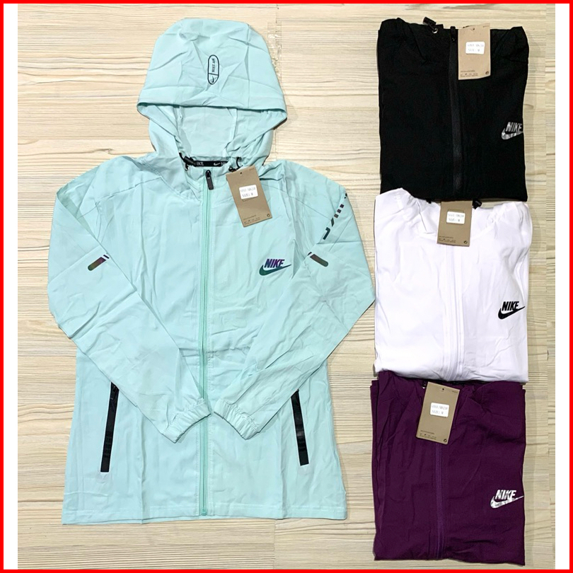 Jaket Micro Wanita N1ke Ladies Ungu Hitam Biru Peach Oren Lengan Panjang Topi Kupluk Import Running Pastel Biru Muda Hit
