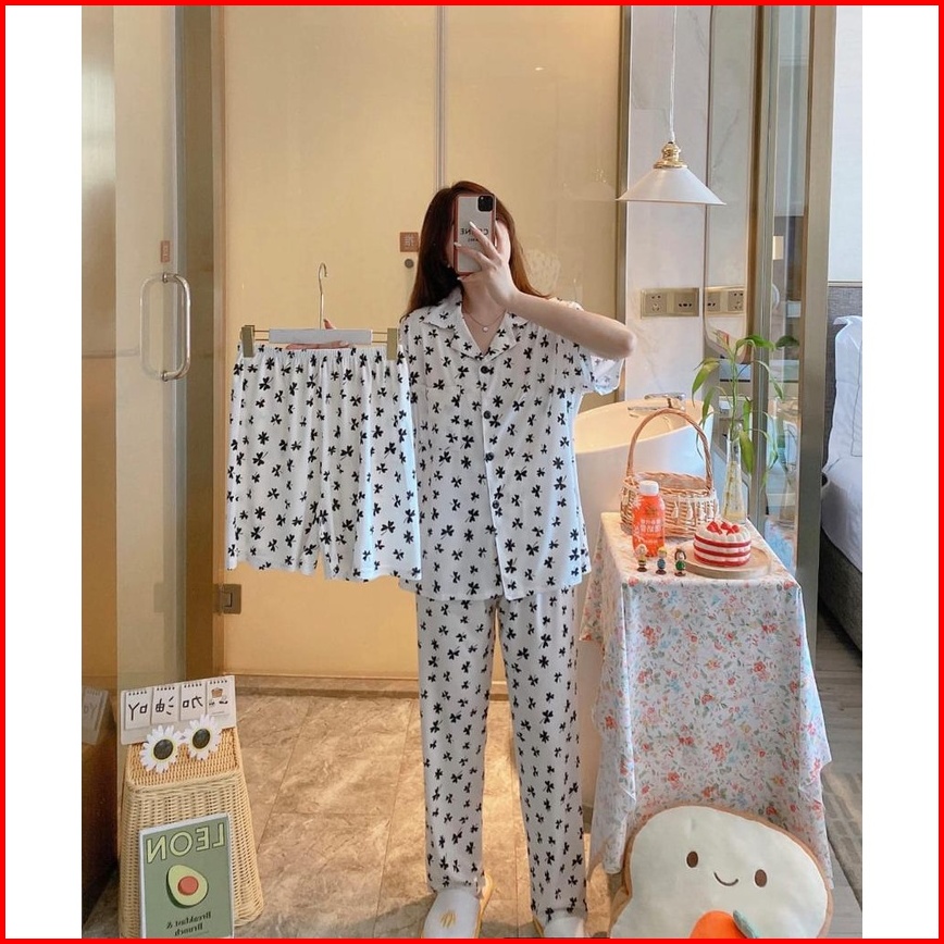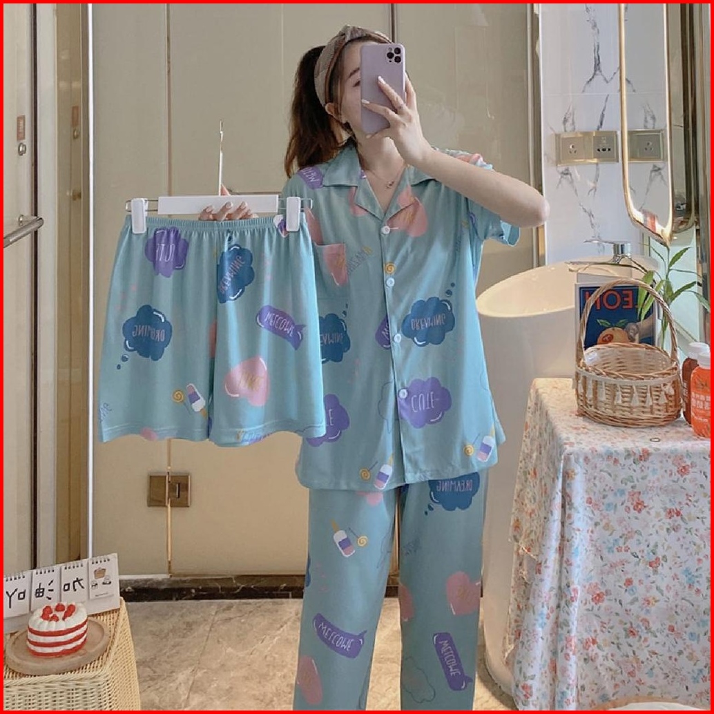 Piyama Kancing Depan Import Set 3in1 Satu Baju Dua Celana Baju Tidur Kancing Depan Piyama Kancing Pendek Baju Tidur Wani