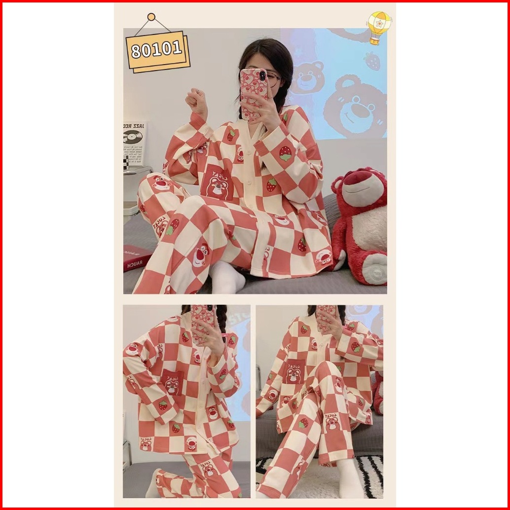 Piyama Dewasa Motif Karakter Lucu Baju Tidur Lengan Panjang Celana Panjang Full Kancing Bahan Katun Polyester Set Setela