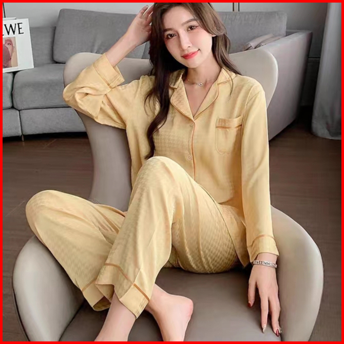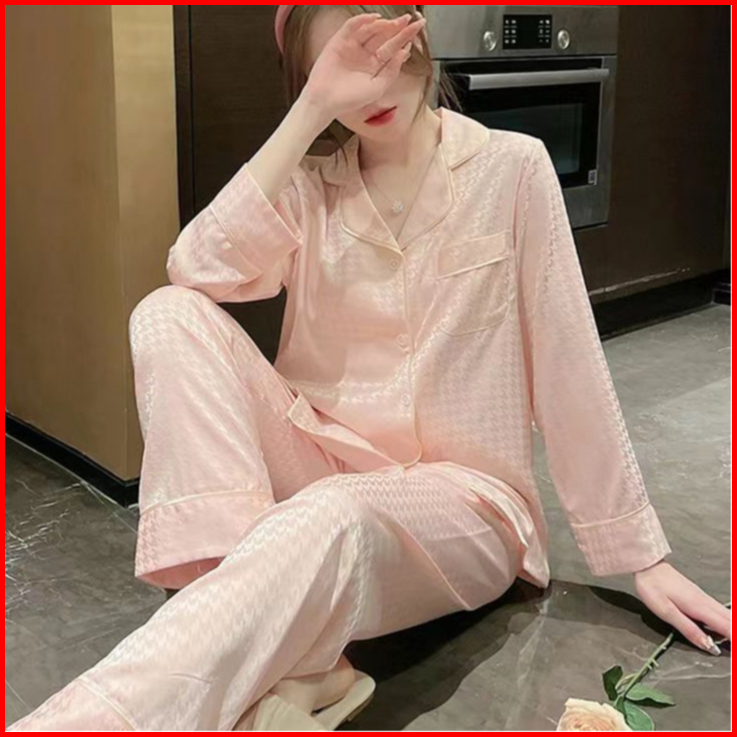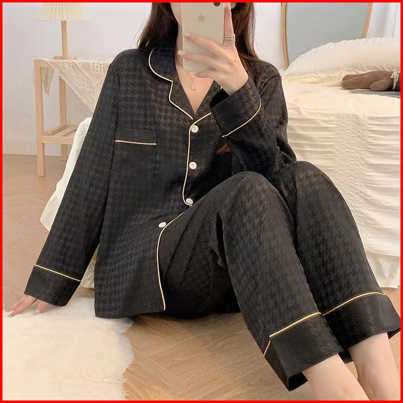 Codpiyama Satin Wanita Lengan Panjang Pakaian Rumah Polos Houndstooth Korea Style