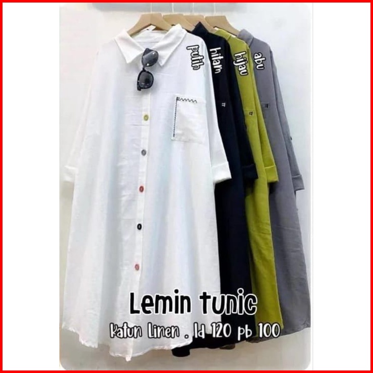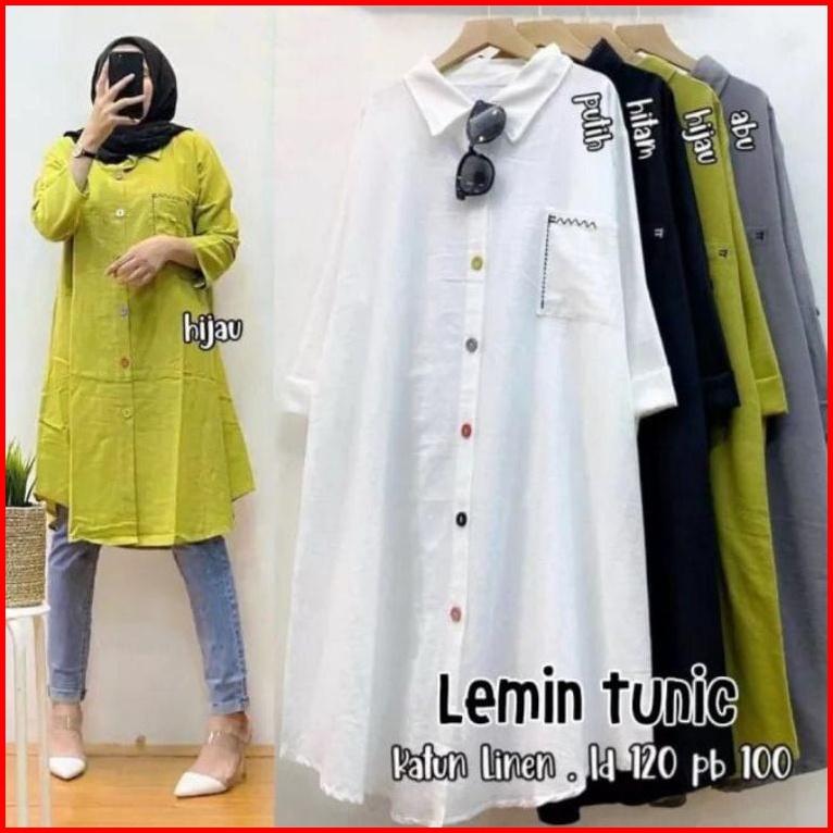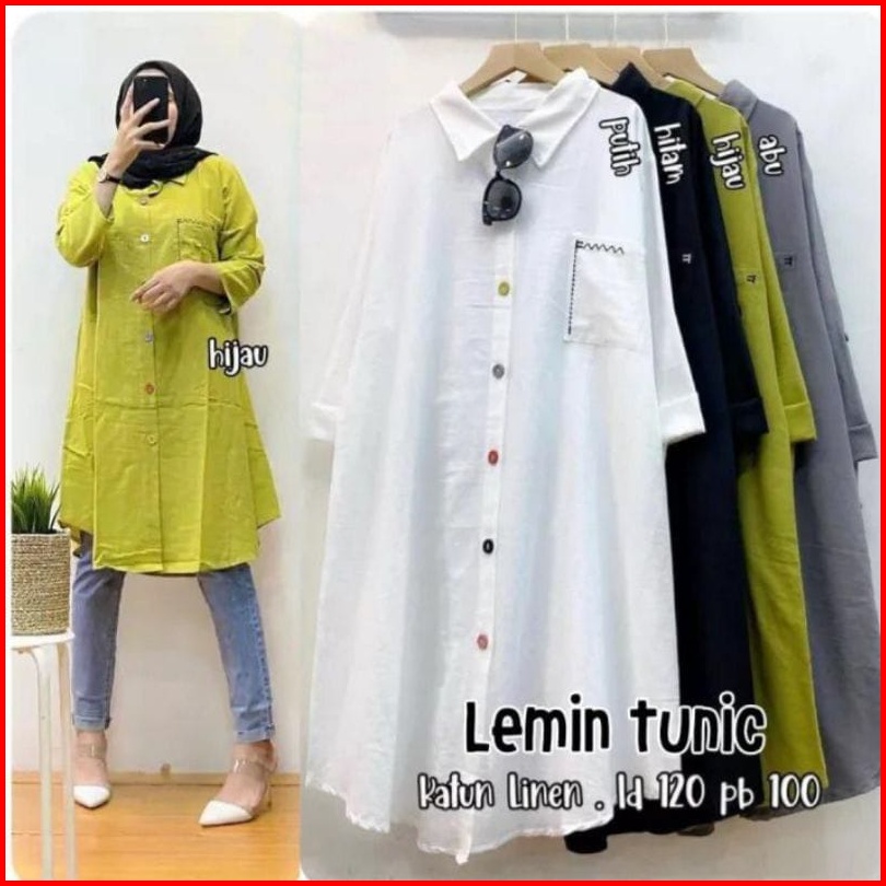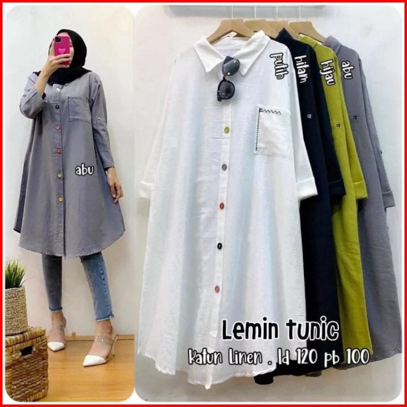 Tunik Katun Linen Model Kekinian Terlaris Ld 110 - 120 Dengan Motif Saku Bordir Atasan Wanita Dewasa Jumbo Full Kancing