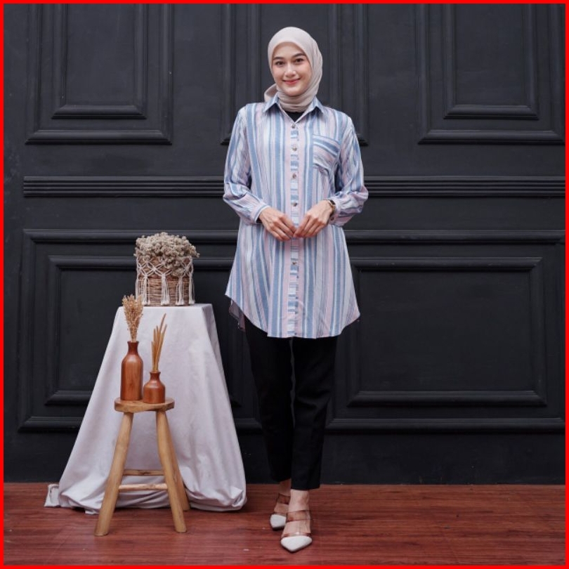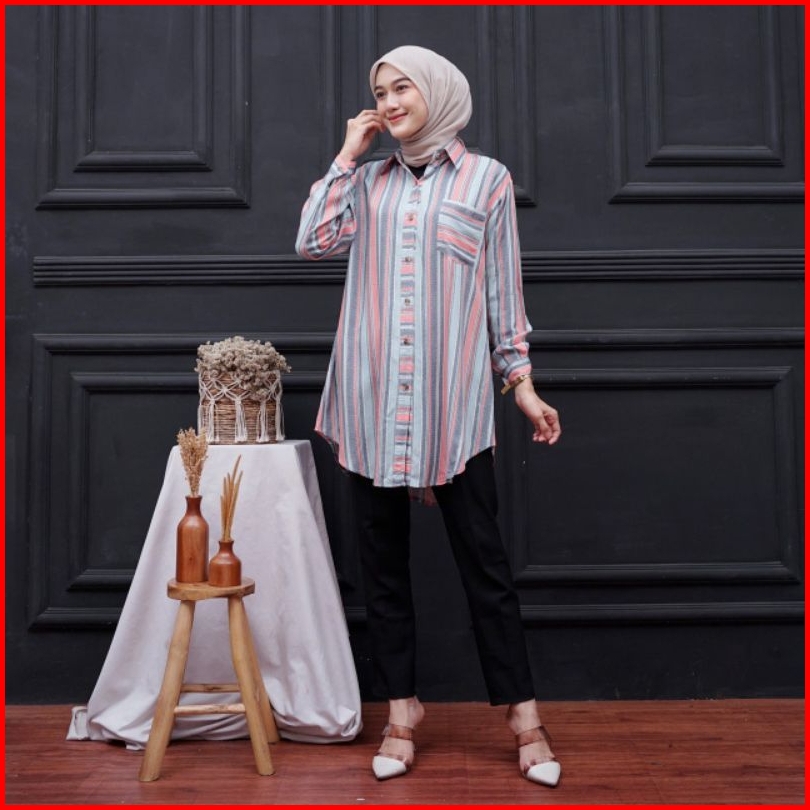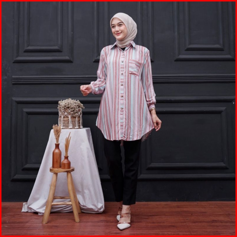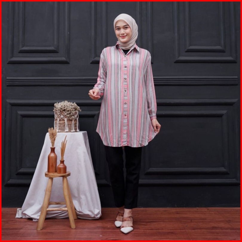 Sakira Tunik Kemeja Salur Wanita Lengan Panjang Rayon