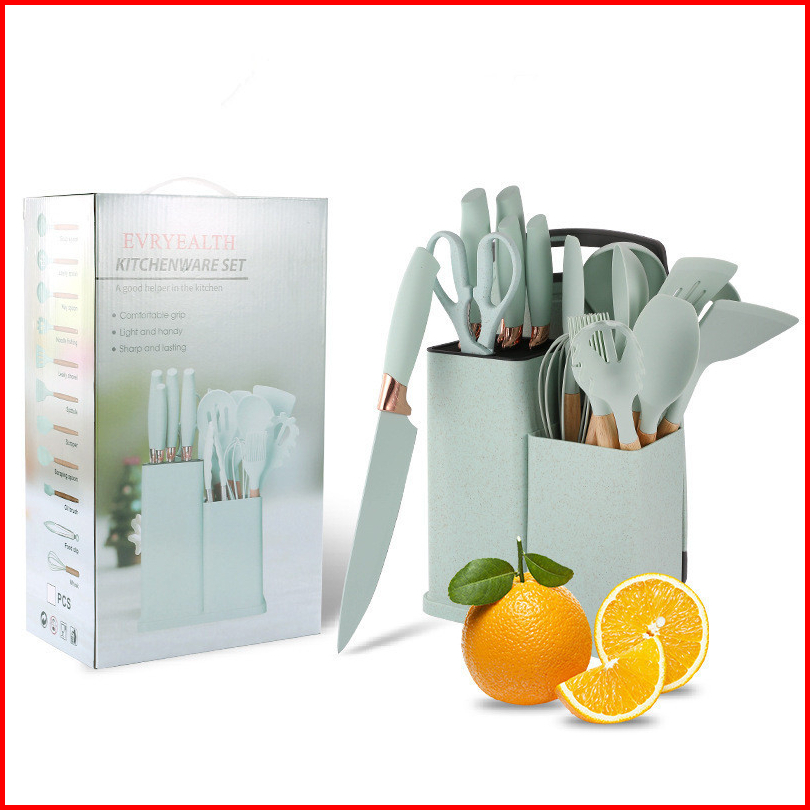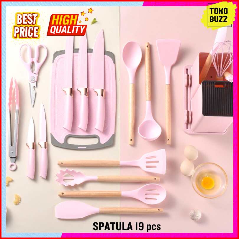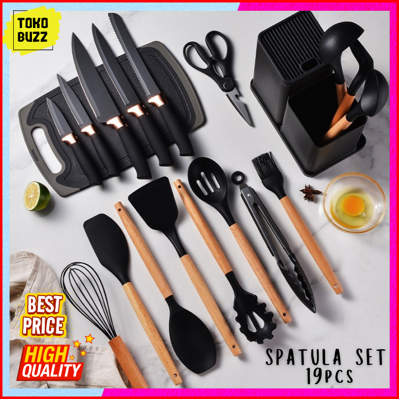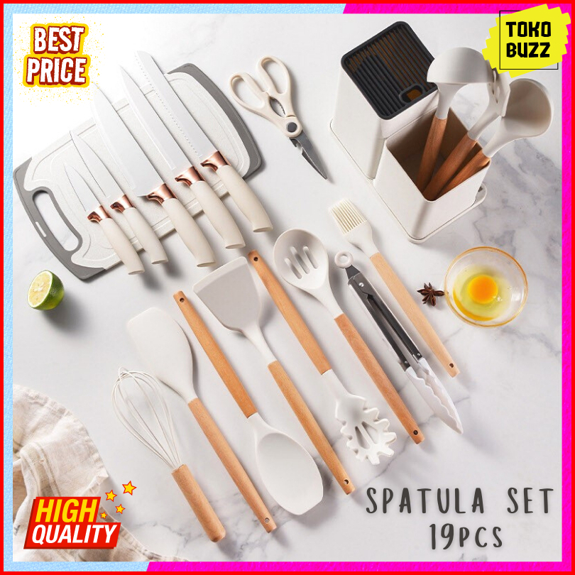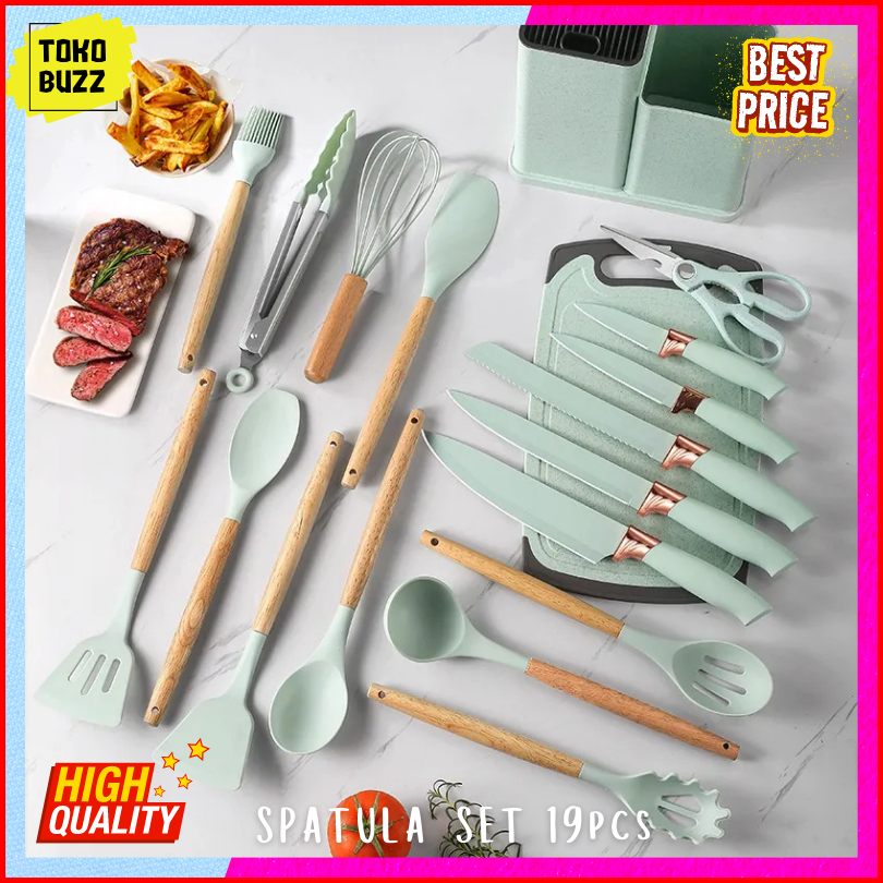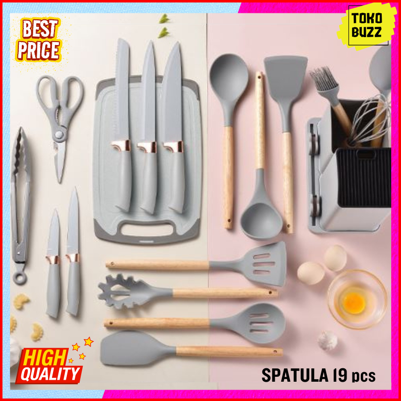 Spatula Silikon Sodet Alat Masak Set 19pcs Sutil Talenan Pisau Capitan Brush Pegangan Kayu Tahan Panas