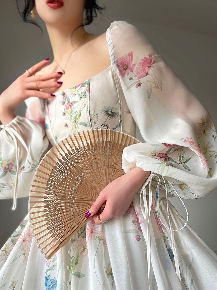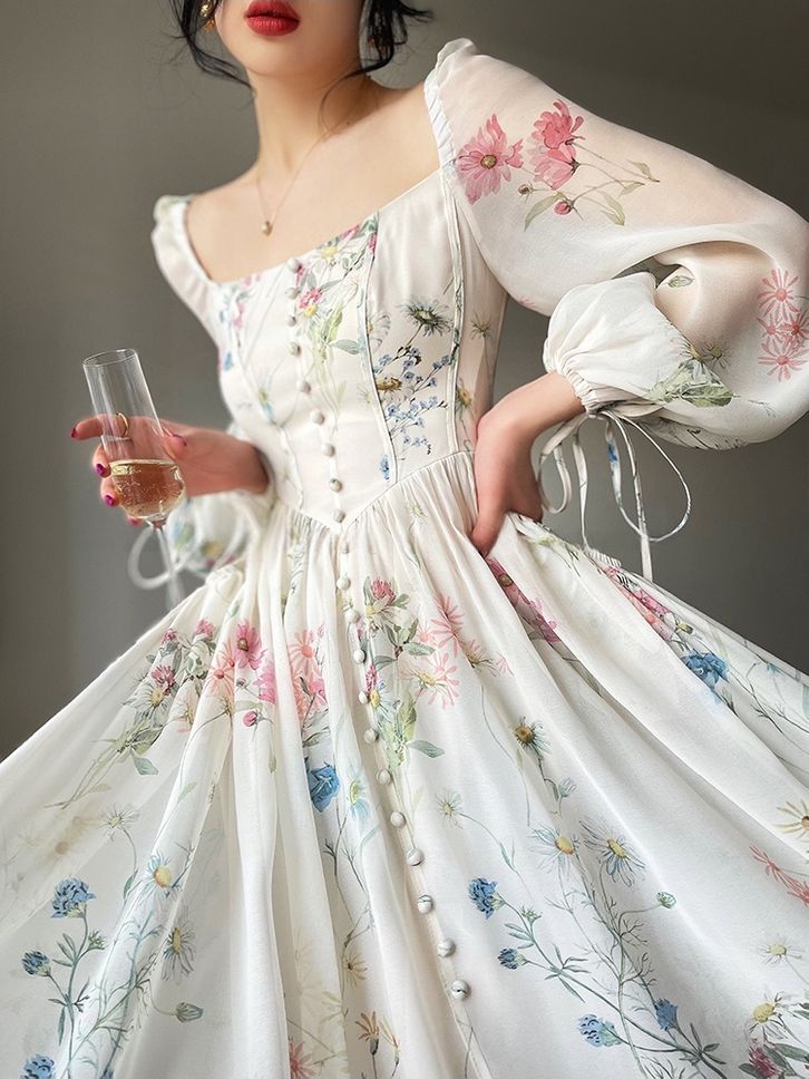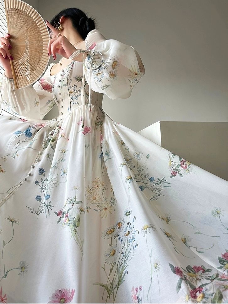 [Star] Floral Dress White | Dress Kondangan Pesta Retro Vintage | Dress Mewah Elegan Lengan Panjang