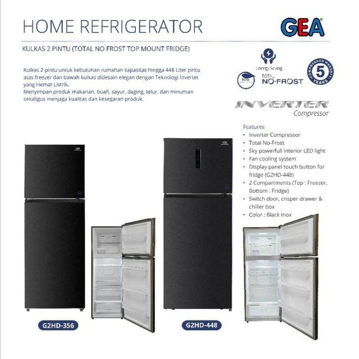 KULKAS GEA G2HD 448 LEMARI ES 2 PINTU G2HD-448 2 PINTU INVERTER