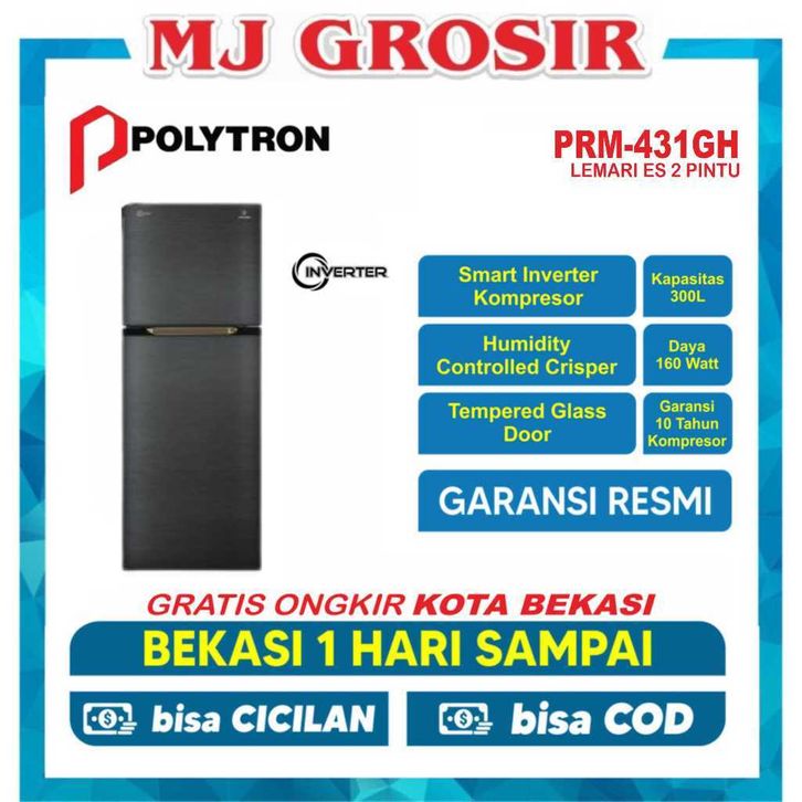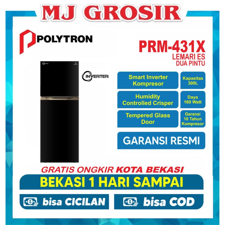 KULKAS POLYTRON PRM 431 LEMARI ES 2 PINTU TEMPERED GLASS INVERTER 300L