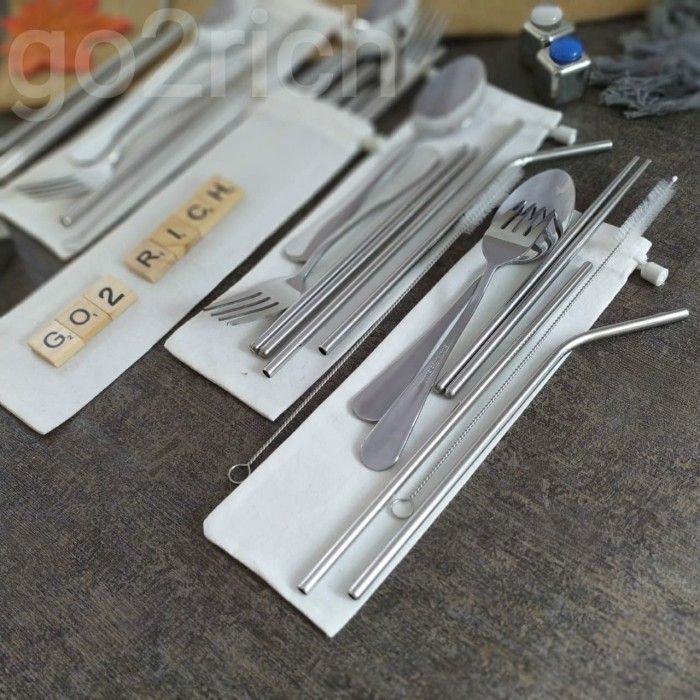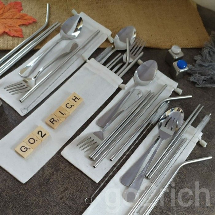 Sedotan Stainless Set Cutlery Alat Makan Sendok Garpu Sumpit + Pouch