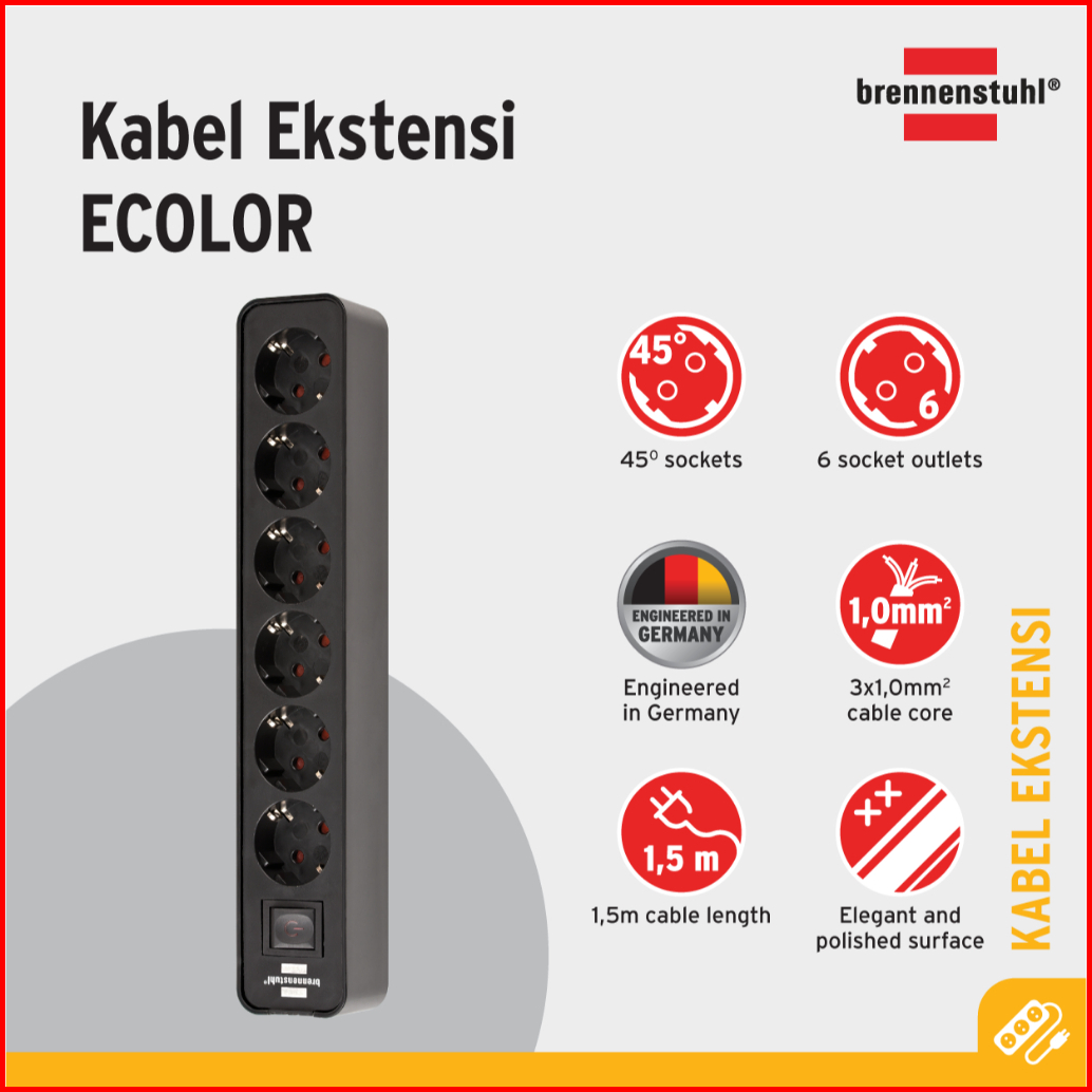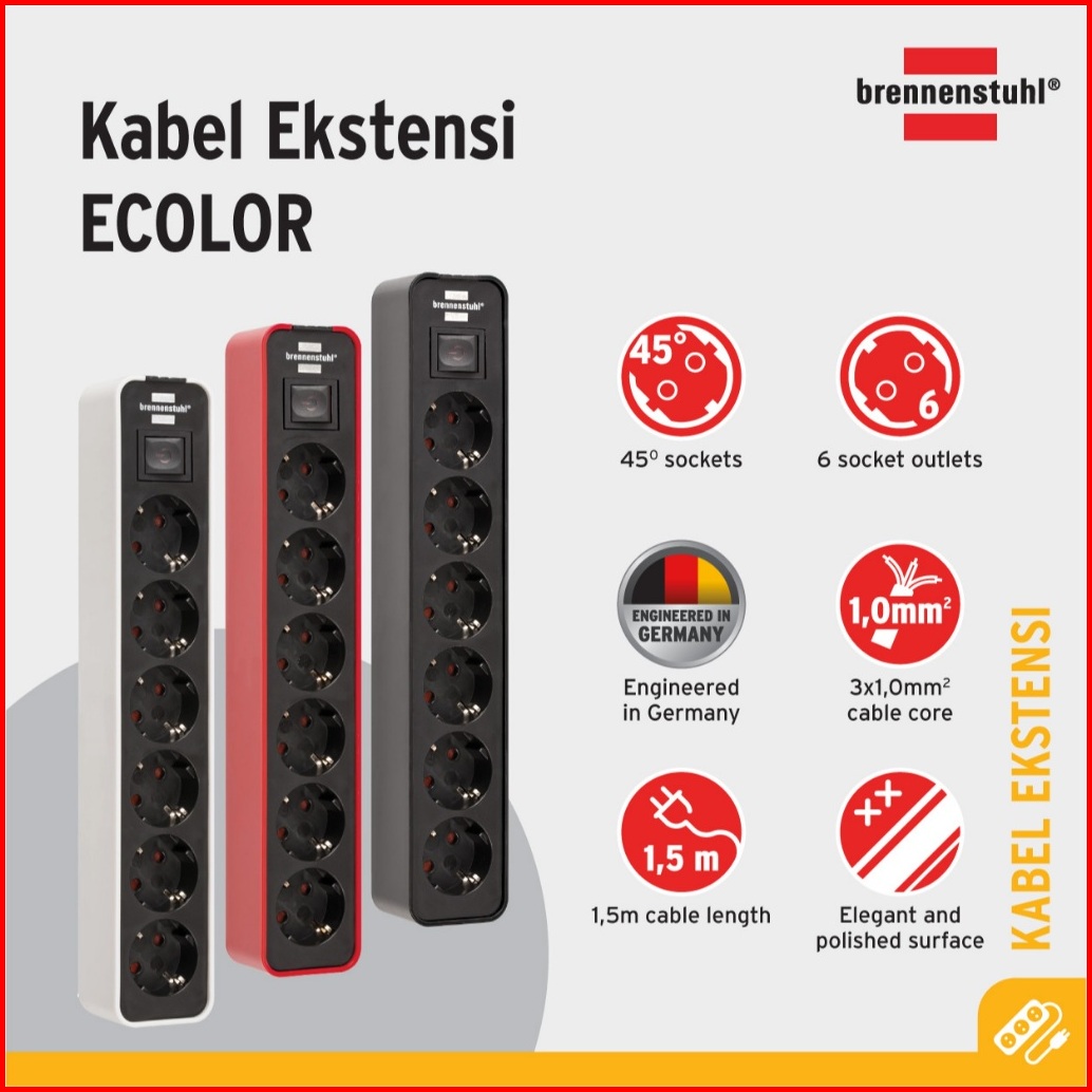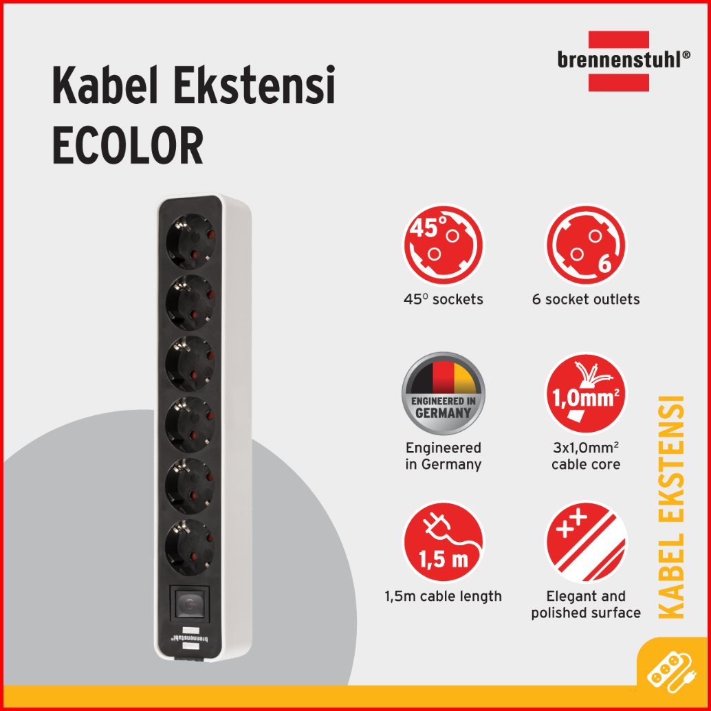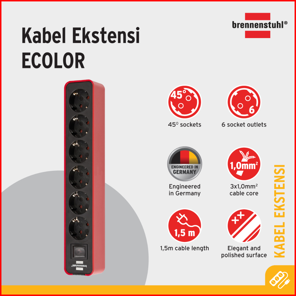 Brennenstuhl Ecolor Stopkontak 6 Soket Dengan Saklar 1 5 M Putih Merah Dan Hitam