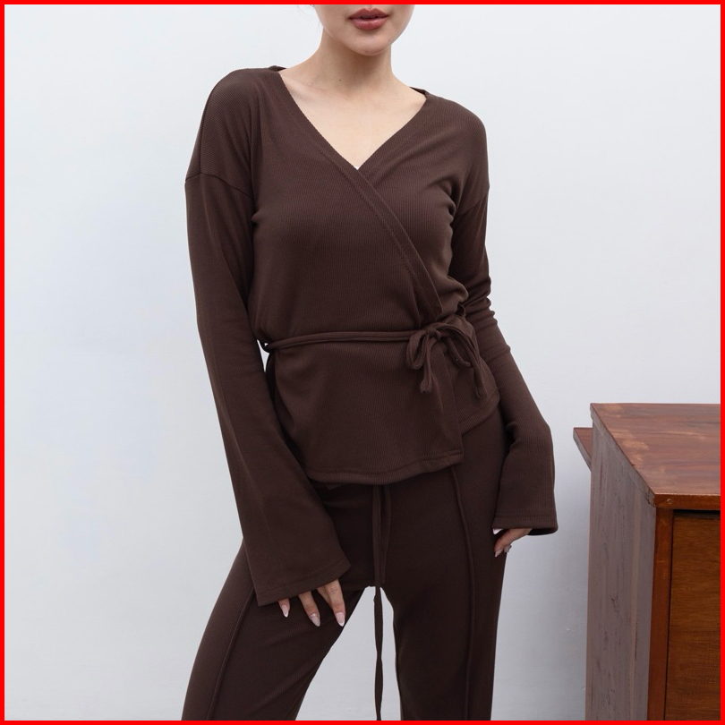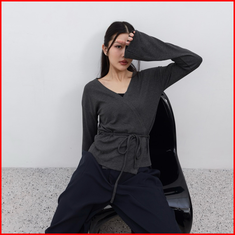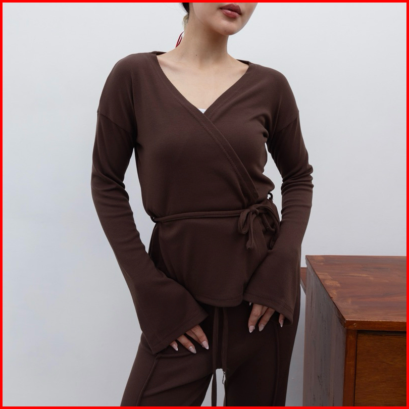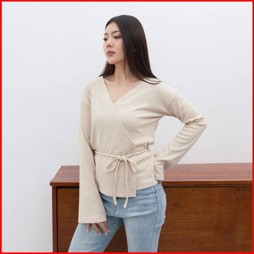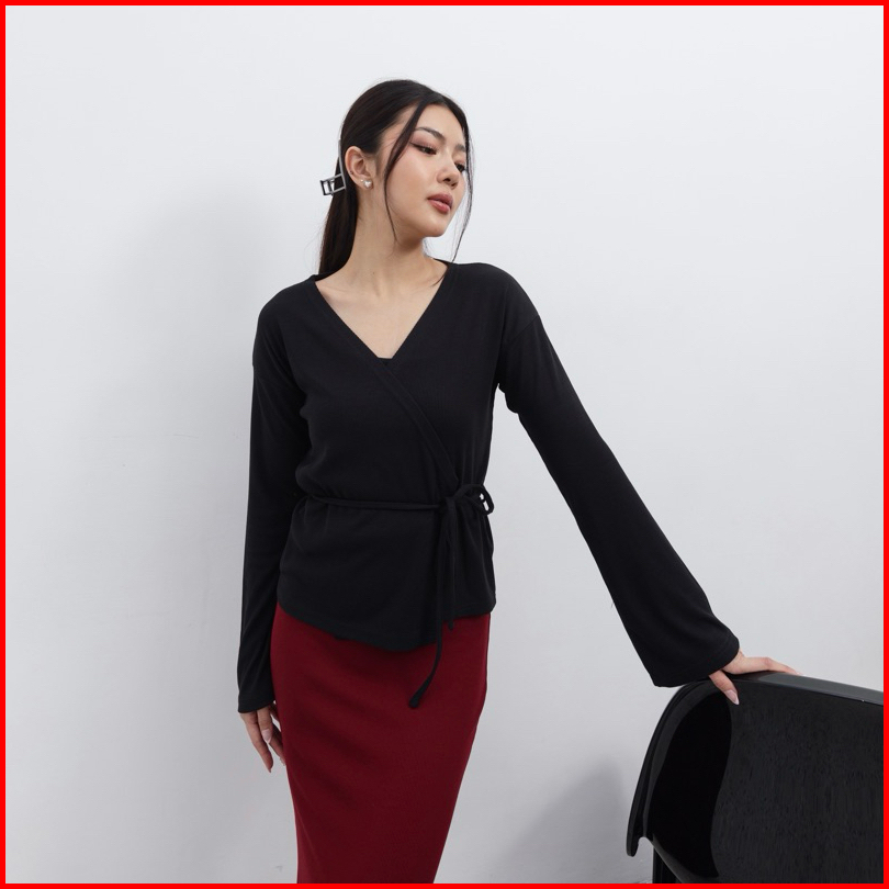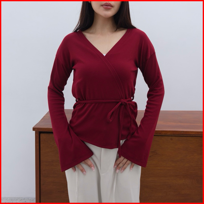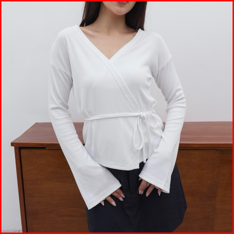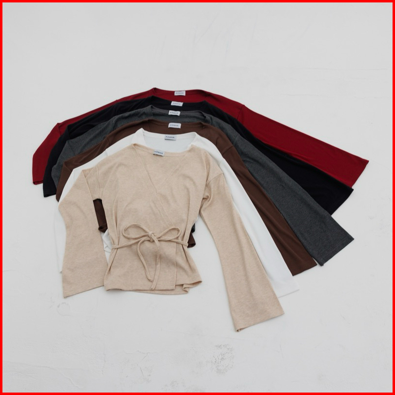 Kiyo Top - Atasan Knit Wanita Lengan Panjang Kimono Ribbon Top Tali V Neck Korean Top Basic Baju Ribbed Knit Rib Long Sl