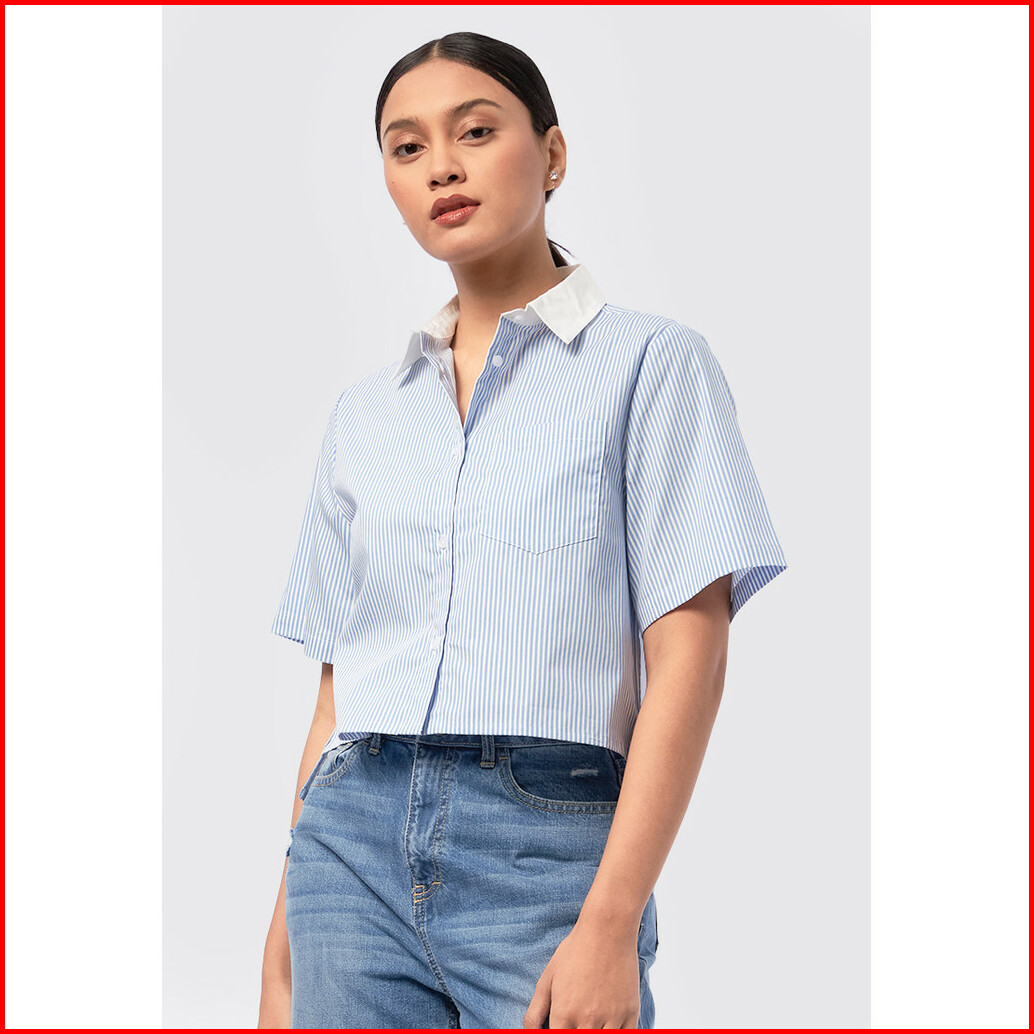 Executive Short Sleeves Stripes Crop Shirt Lt. Blue