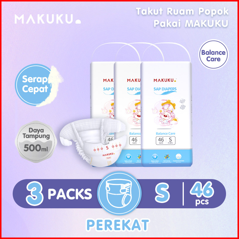 3 Pack Makuku Sap Diapers Balance Care Tape S46 X 3 Pack Popok Bayi Tipis Extra Dry Anti Gumpal Mengunci Cairan Cepat Ke