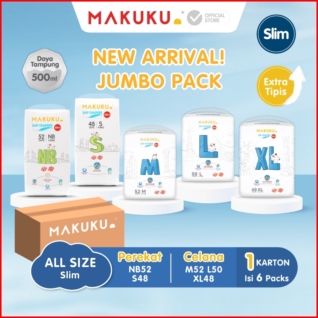 6 Pack Karton Makuku Sap Diapers Slim Jumbo Popok Bayi Tipis Sap Anti Gumpal Cepat Kering Sekali Pakai Tipe Nb52 S48 M52