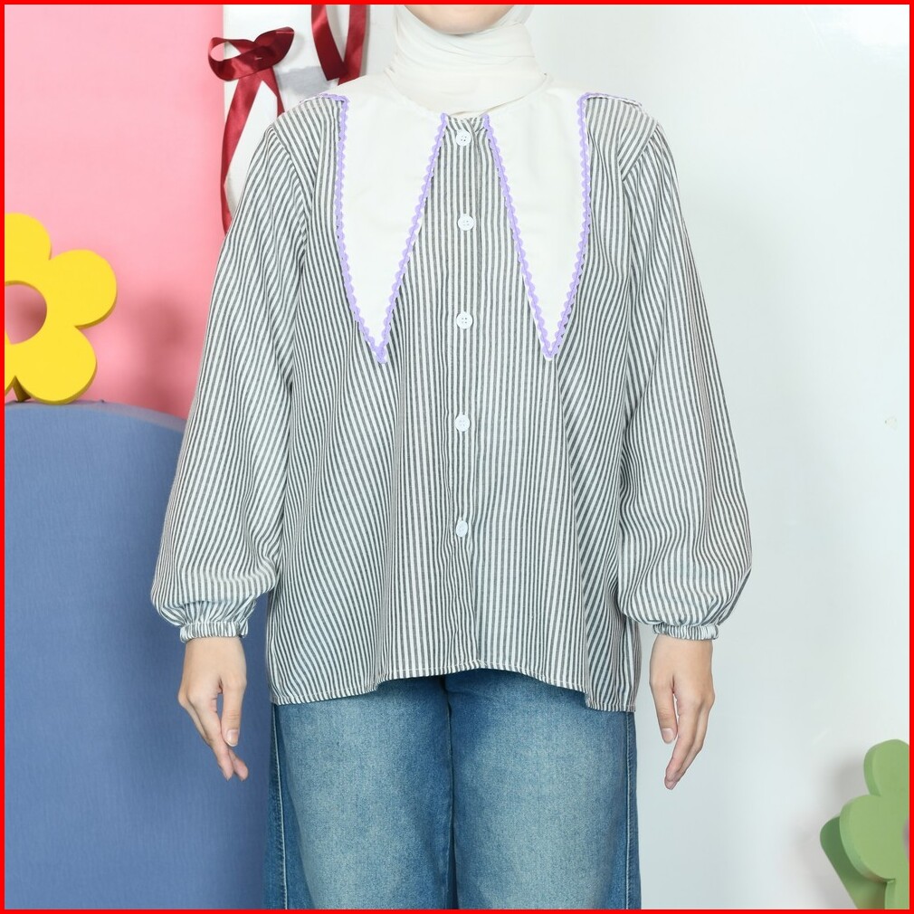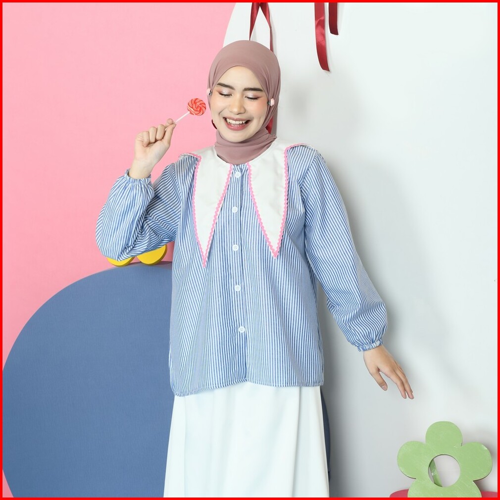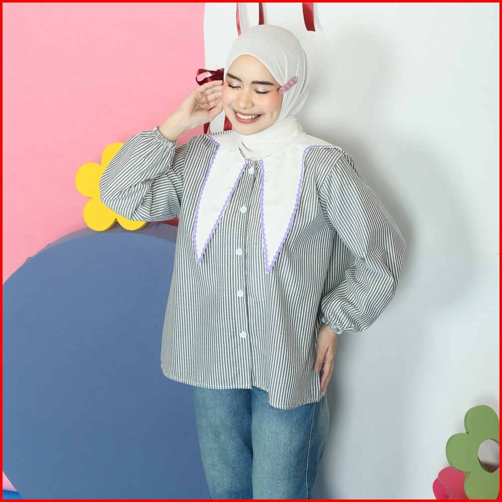 Mybamus Bunny Kemeja Stripe Atasan Garis Kekinian Variasi Kerah Renda Zigzag Stripe