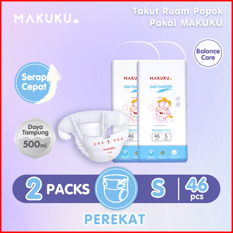 2 Pack Makuku Sap Diapers Balance Care Tape S46 Popok Bayi Tipis Sap Anti Gumpal Cepat Kering Sekali Pakai Tipe Celana P