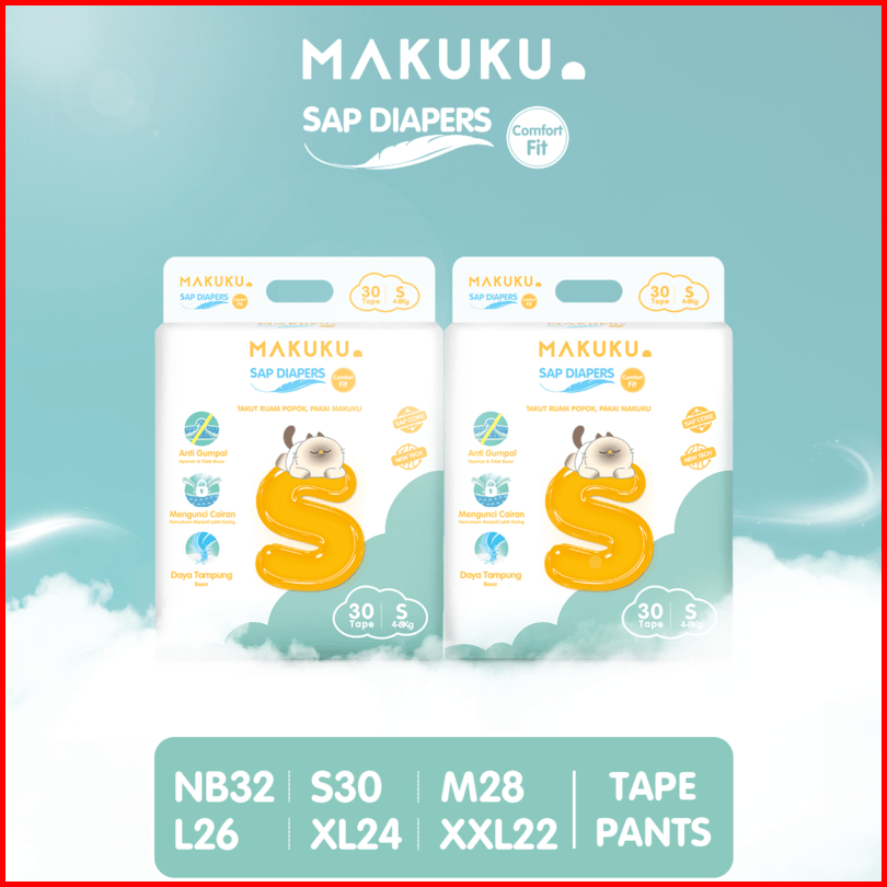 2 Pack Makuku Sap Diapers Comfort Fit Tape S30 Popok Bayi Tipis Extra Dry Anti Gumpal Mengunci Cairan Cepat Kering Type