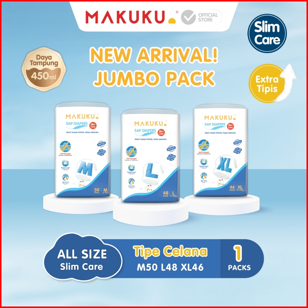 1 Pack Makuku Sap Diapers Slim Care Jumbo Pants M L Xl Popok Bayi Tipis Extra Dry Anti Gumpal Mengunci Cairan Cepat Keri