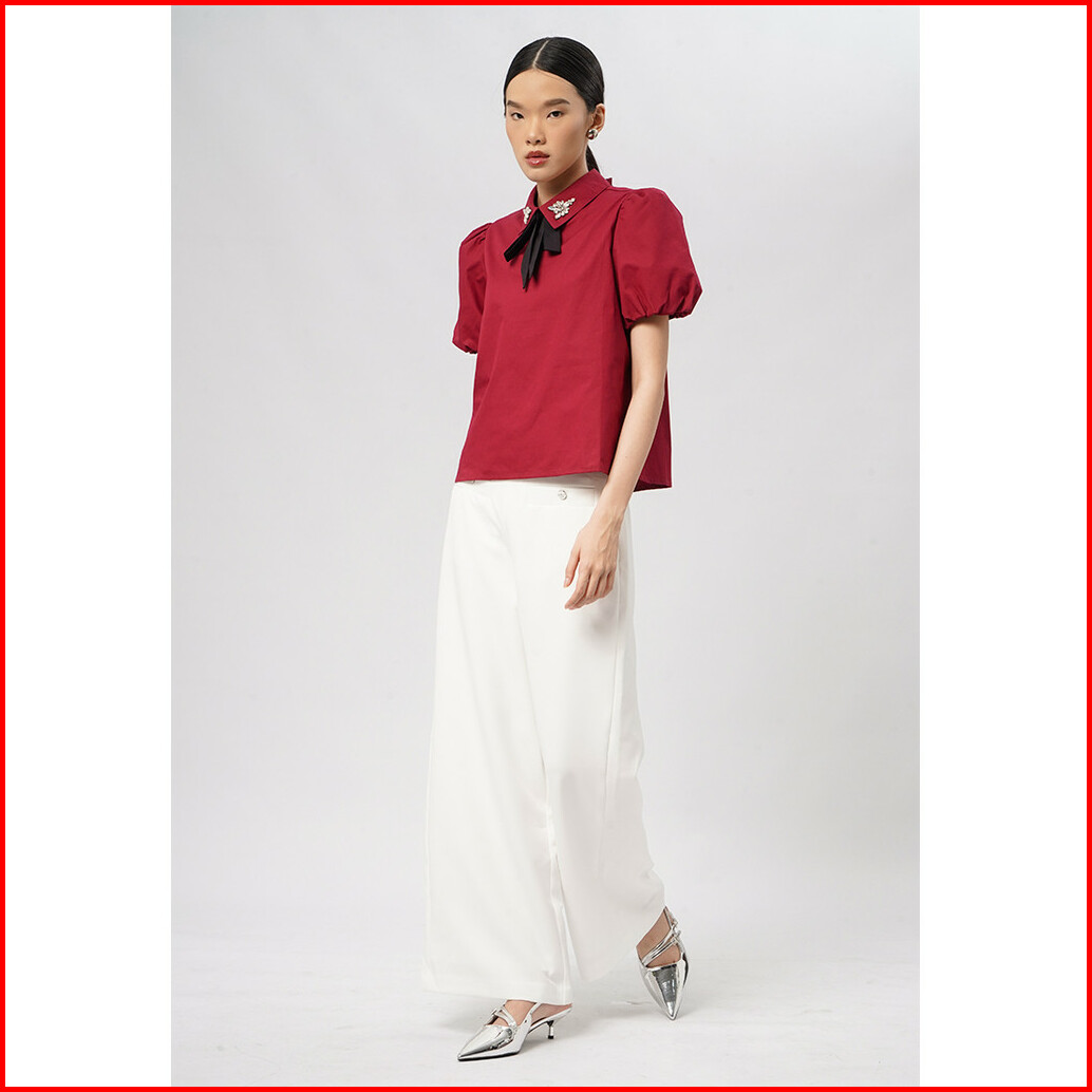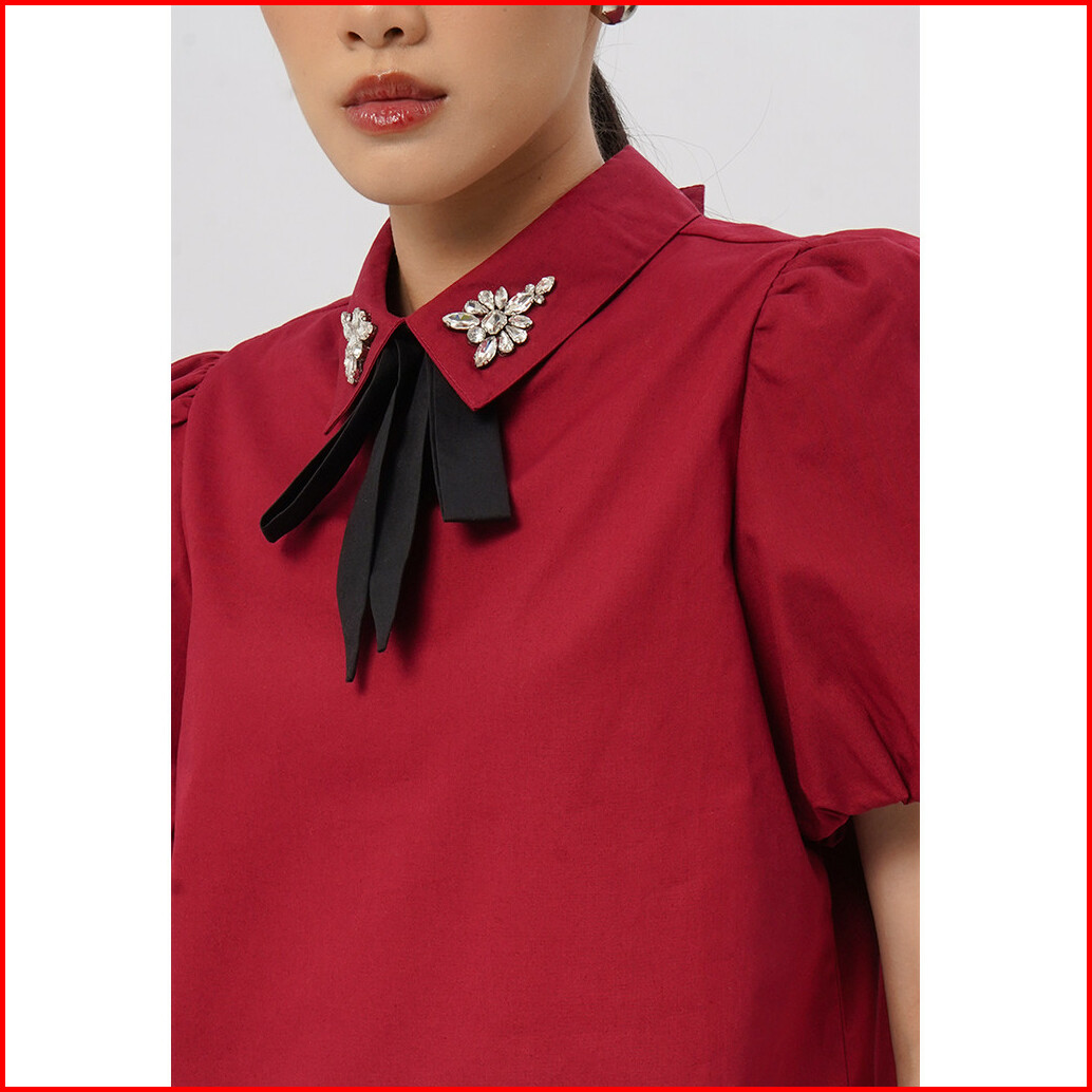 Executive Short Sleeve Blouse With Bow Tie Dark Red