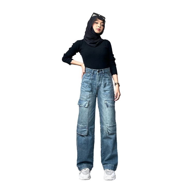 Celana Jeans Wanita Cargo JINISO - Highwaist Cargo Loose Jeans 555 PSYCHO