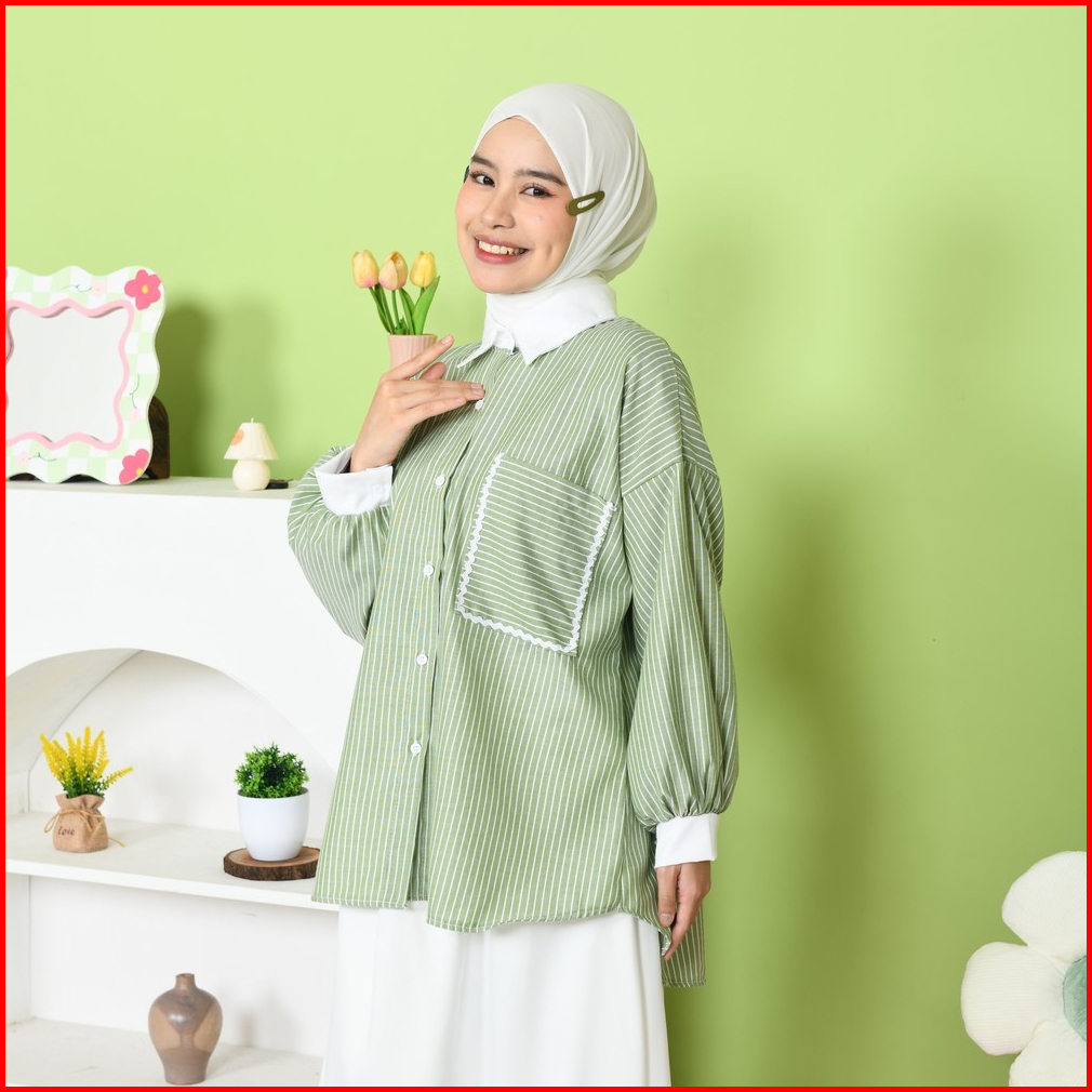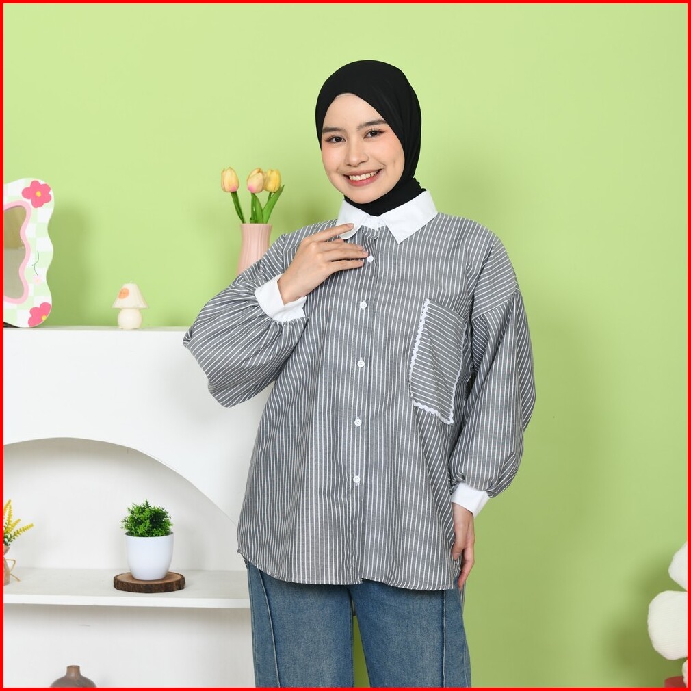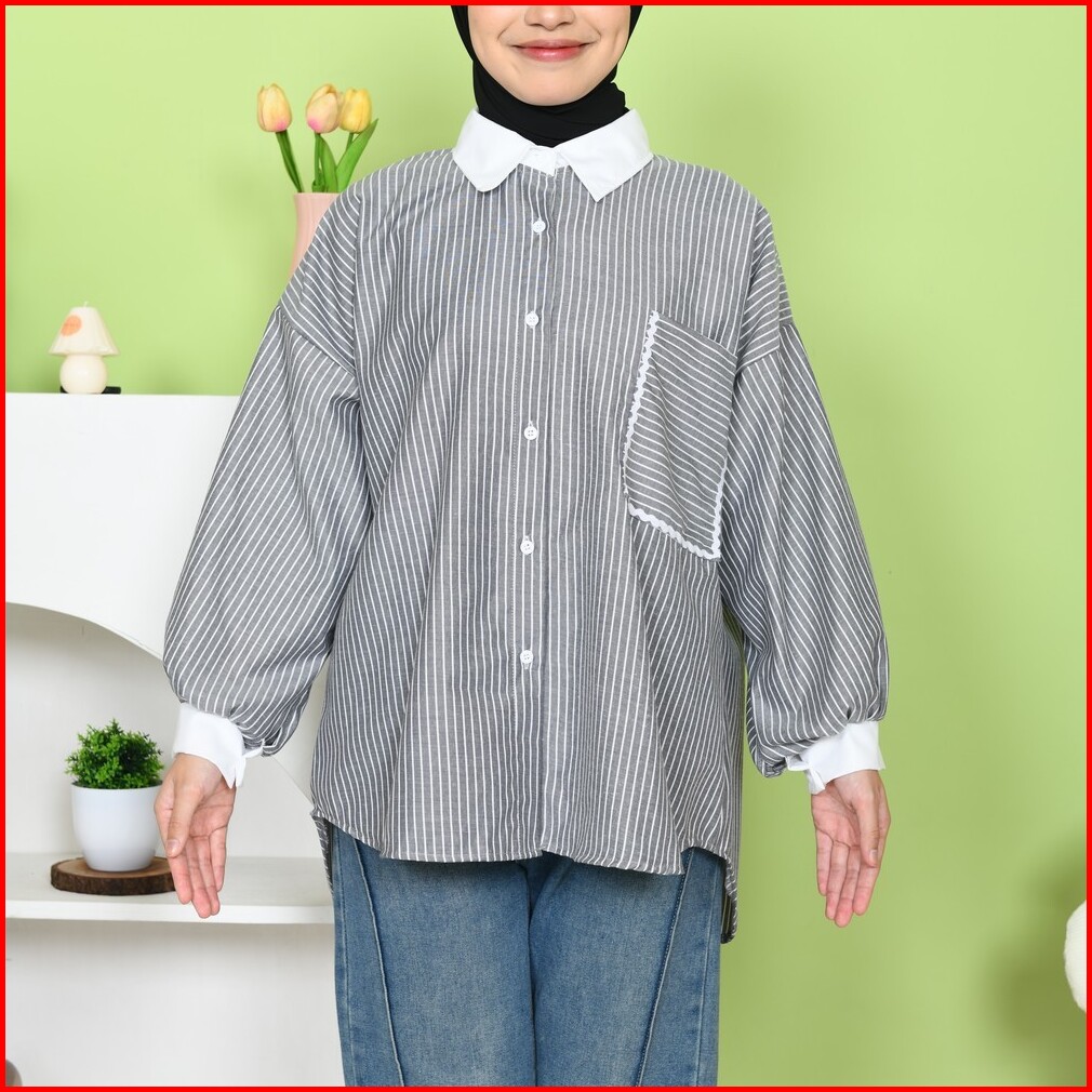 Mybamus Yemima Stripe Shirt Kemeja Oversize Korean Style Baju Kerja Salur Saku Renda Kekinian