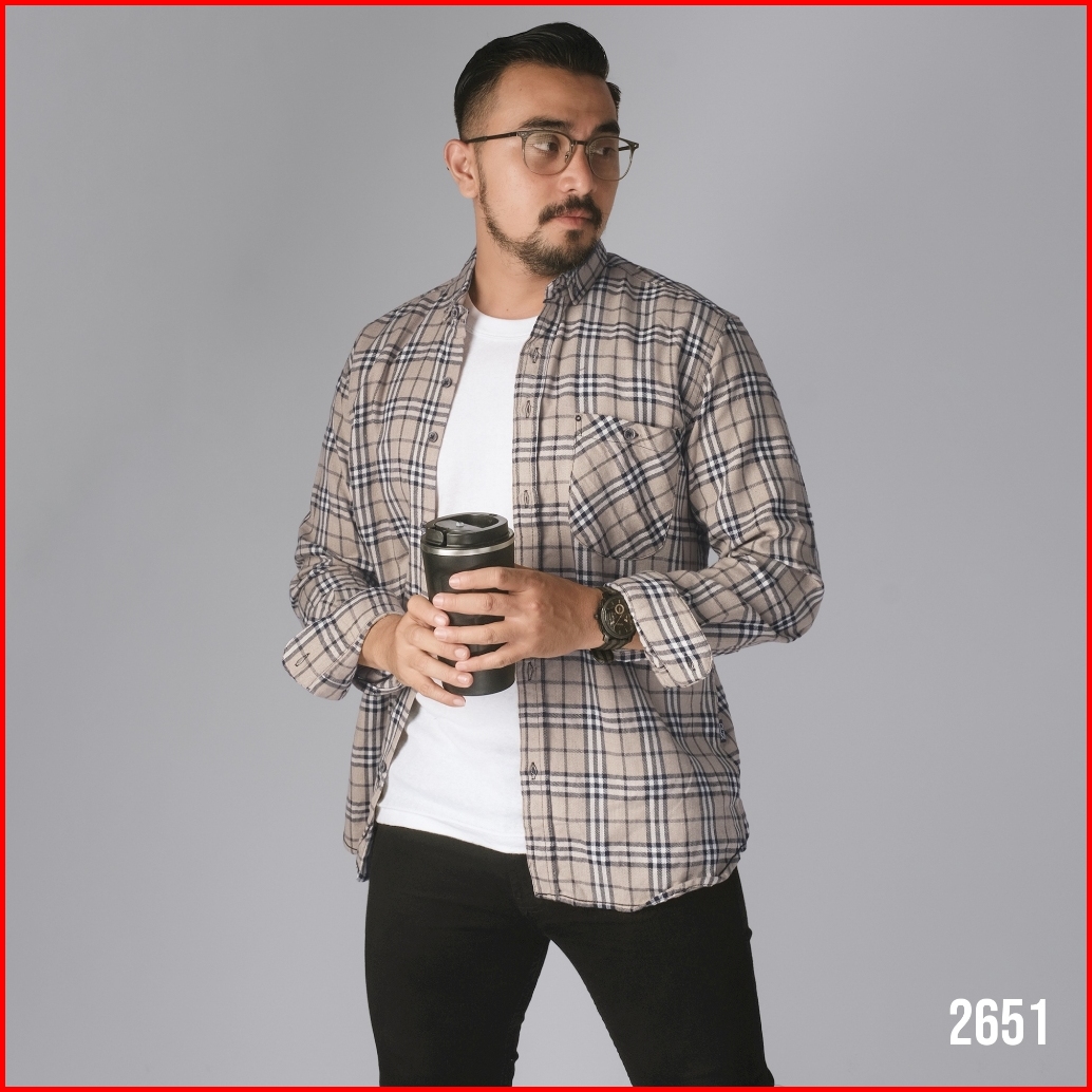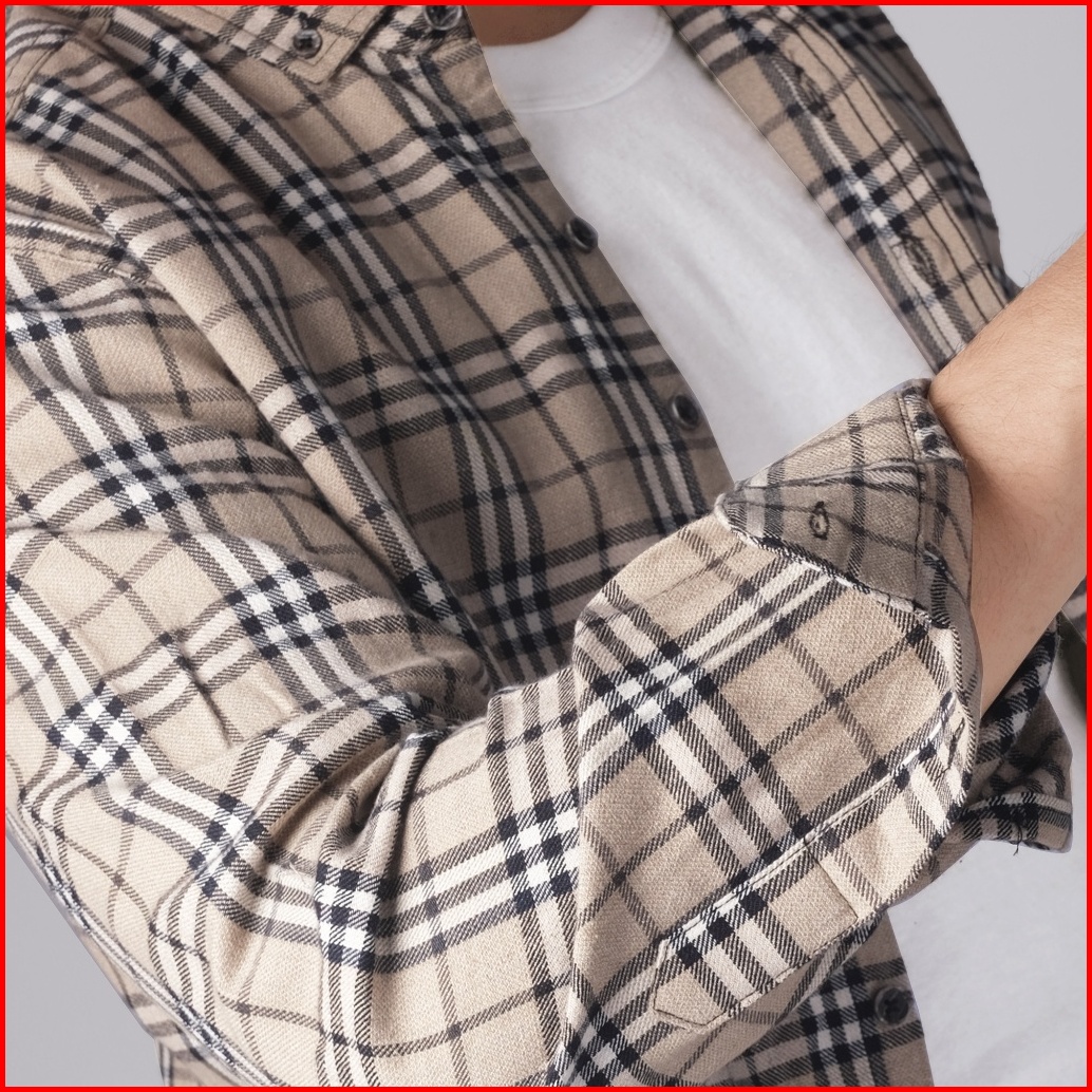 Dgm Kemeja Pria Flanel Panjang Premium Kotak Kotak Kemeja Flanel Krem Garis Putih - Hitam 2651