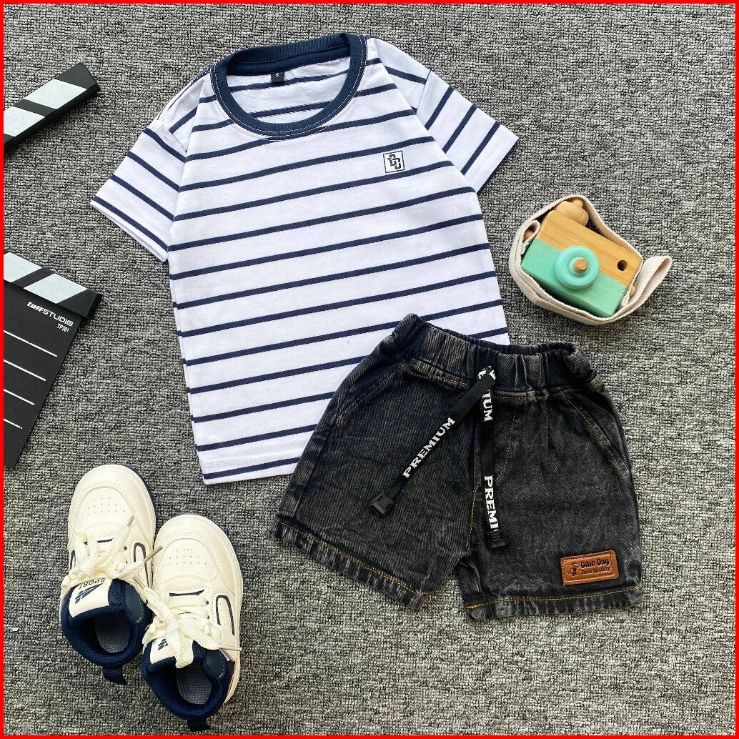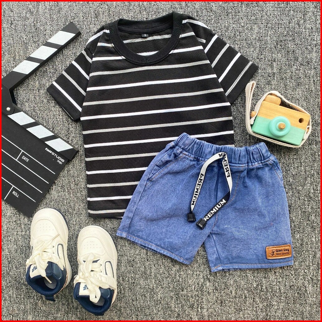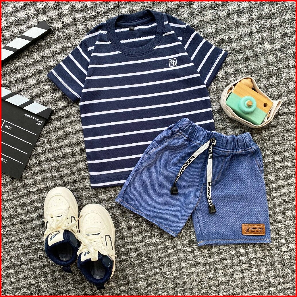 Estishop X Dinoday Setelan Baju Anak Laki Kaos Salur Stripe Celana Jeans Pendek 1 - 9 Tahun