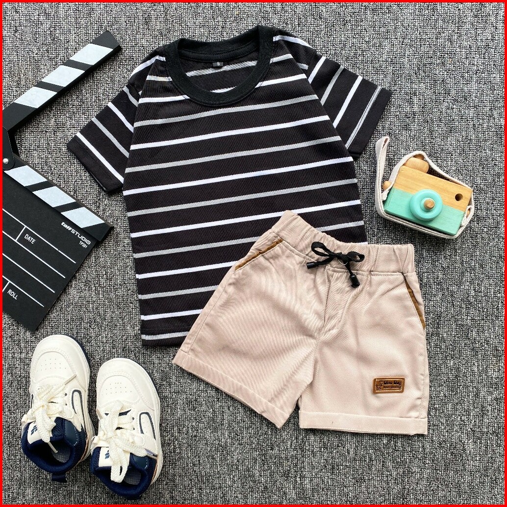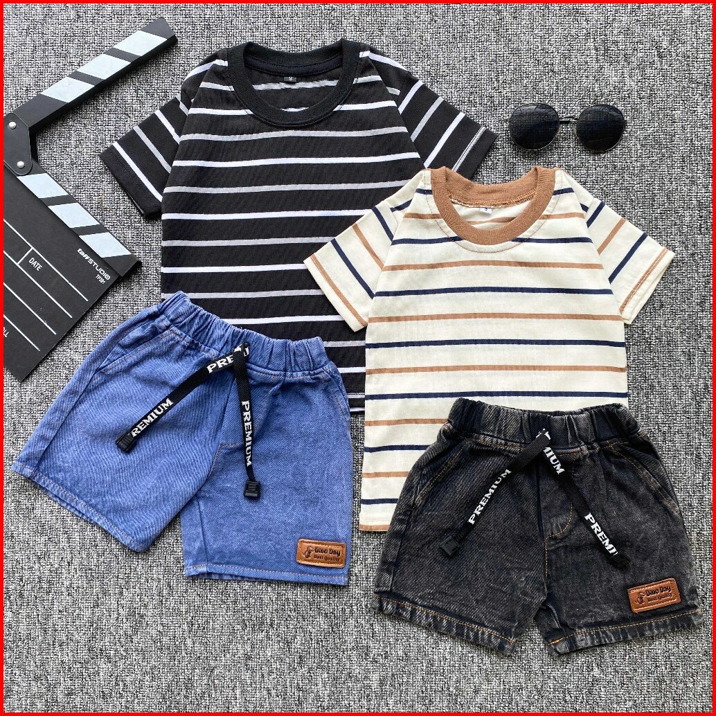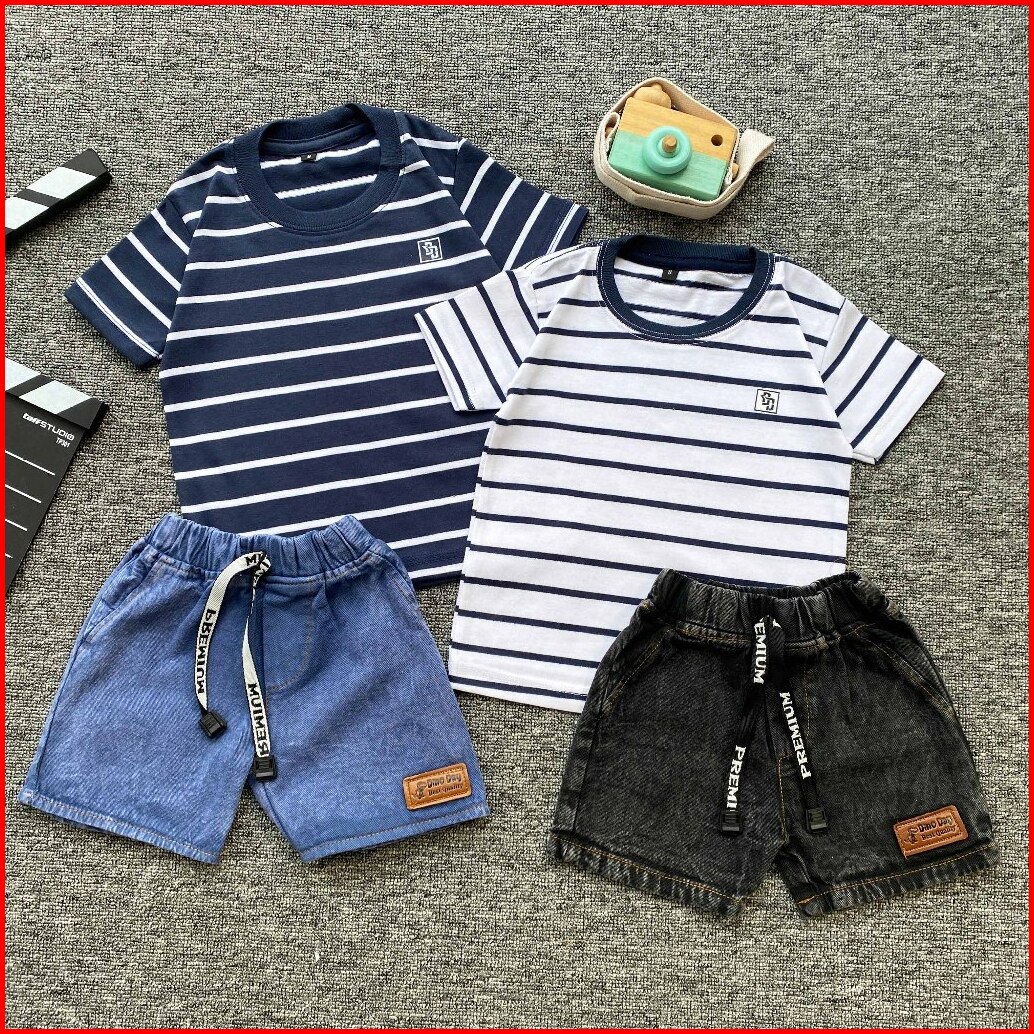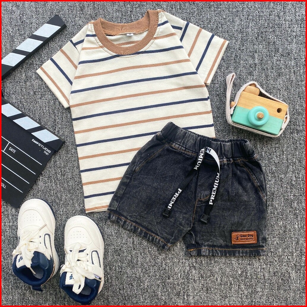 Estishop X Dinoday Setelan Baju Anak Laki Kaos Salur Stripe Celana Jeans Pendek 1 - 9 Tahun