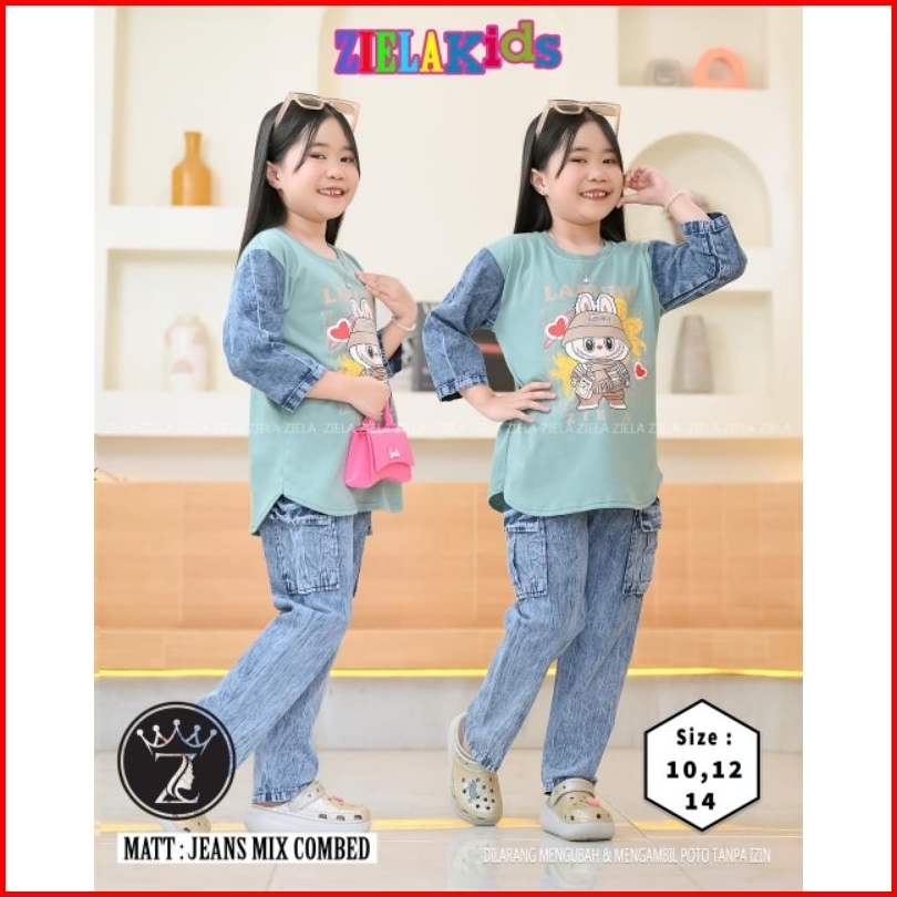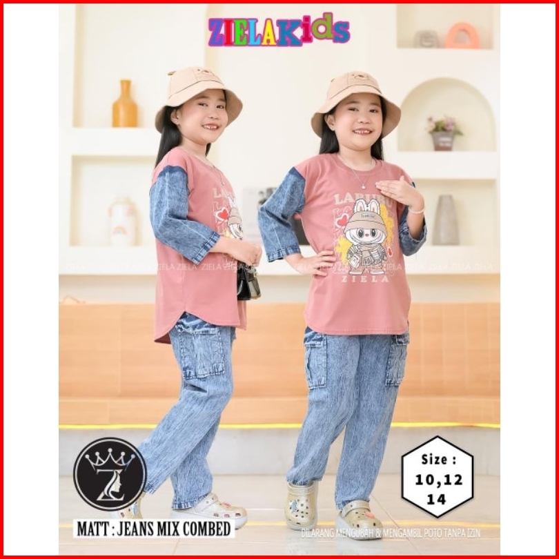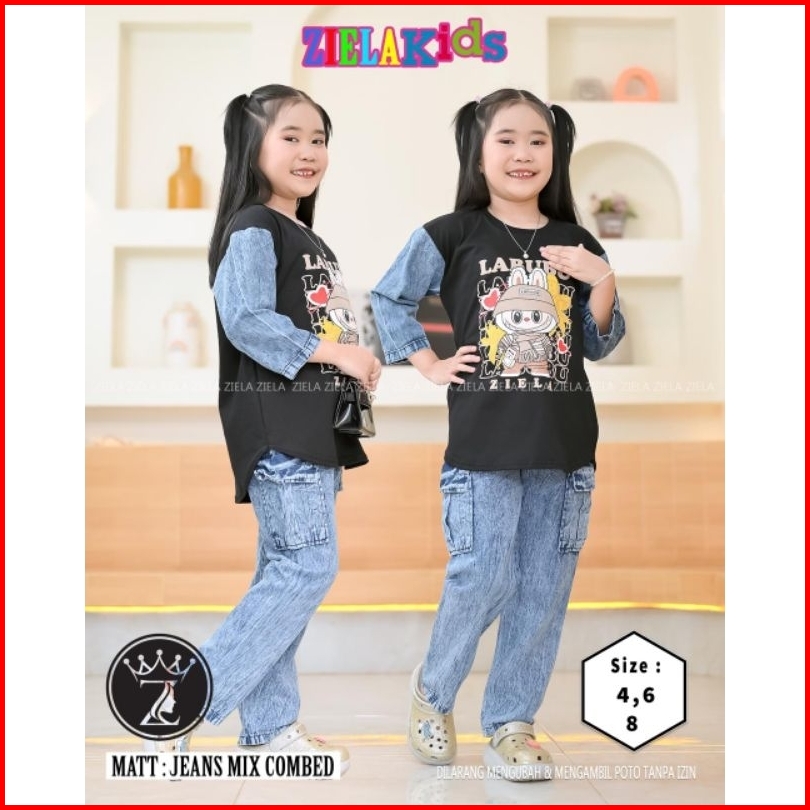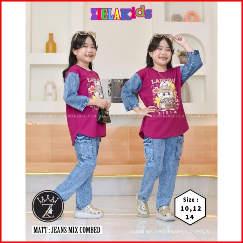 Setelan Anak Labubu Bahan Cotton Combad 20s Mix Jeans Cargo Ori Ziela Kids Setelan Anak Perempuan Umur 4-14 Tahun Setela