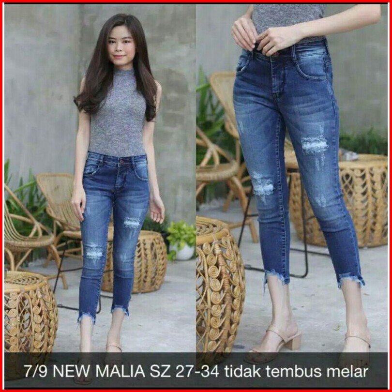 Ready Stok Calana Wanita Cewek 7 9 New Malia Size 27-38 Sobek Tidak Tembus Jeans Melar