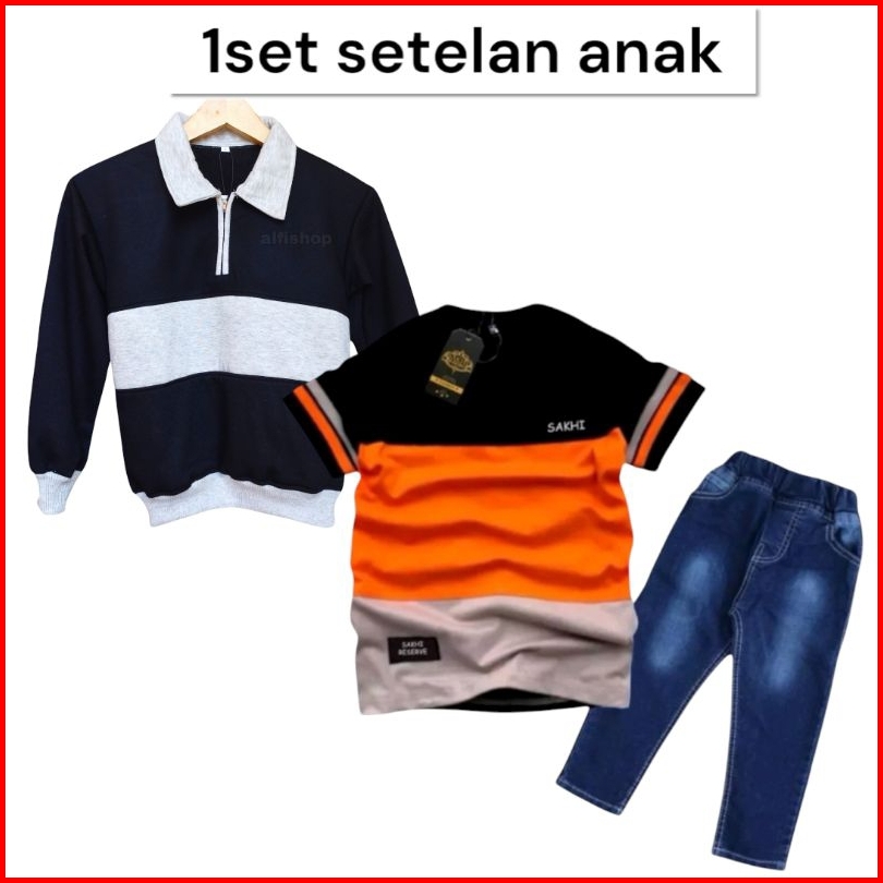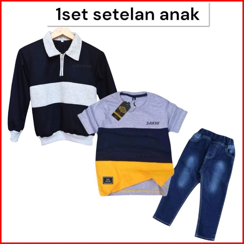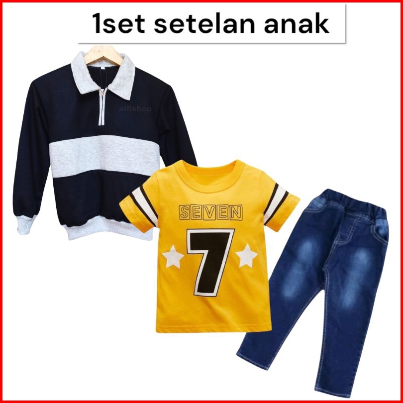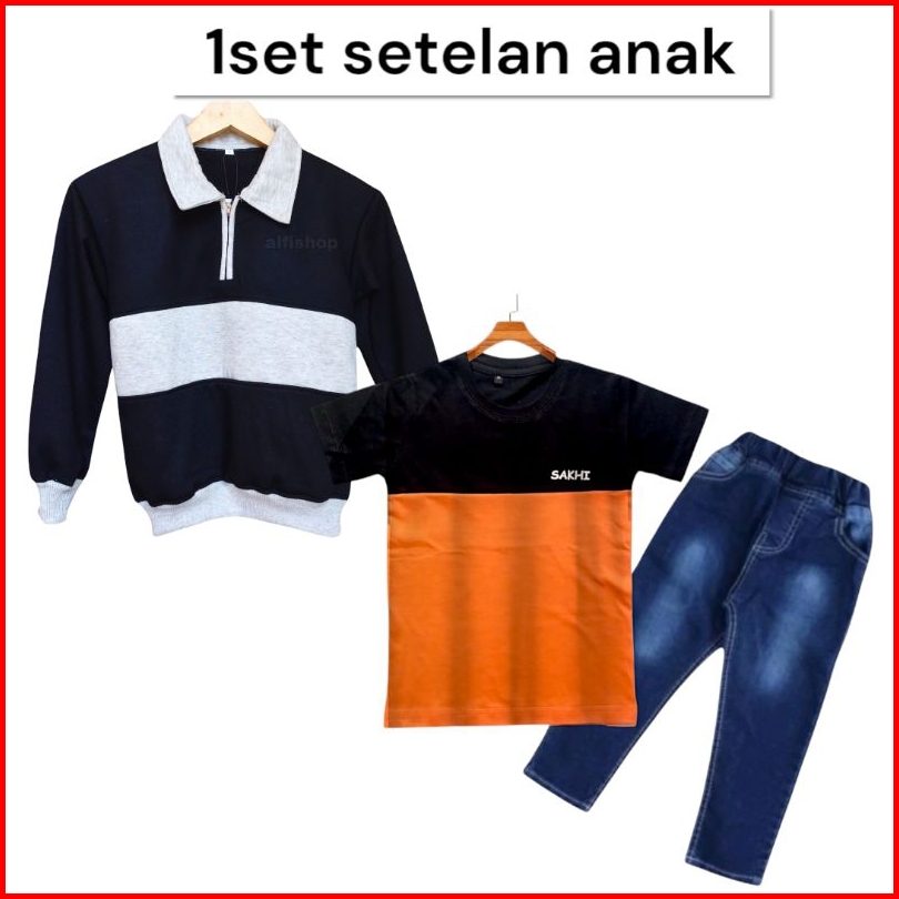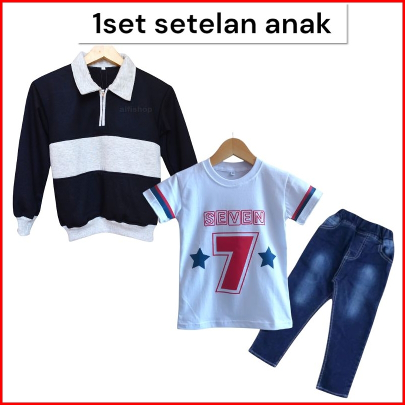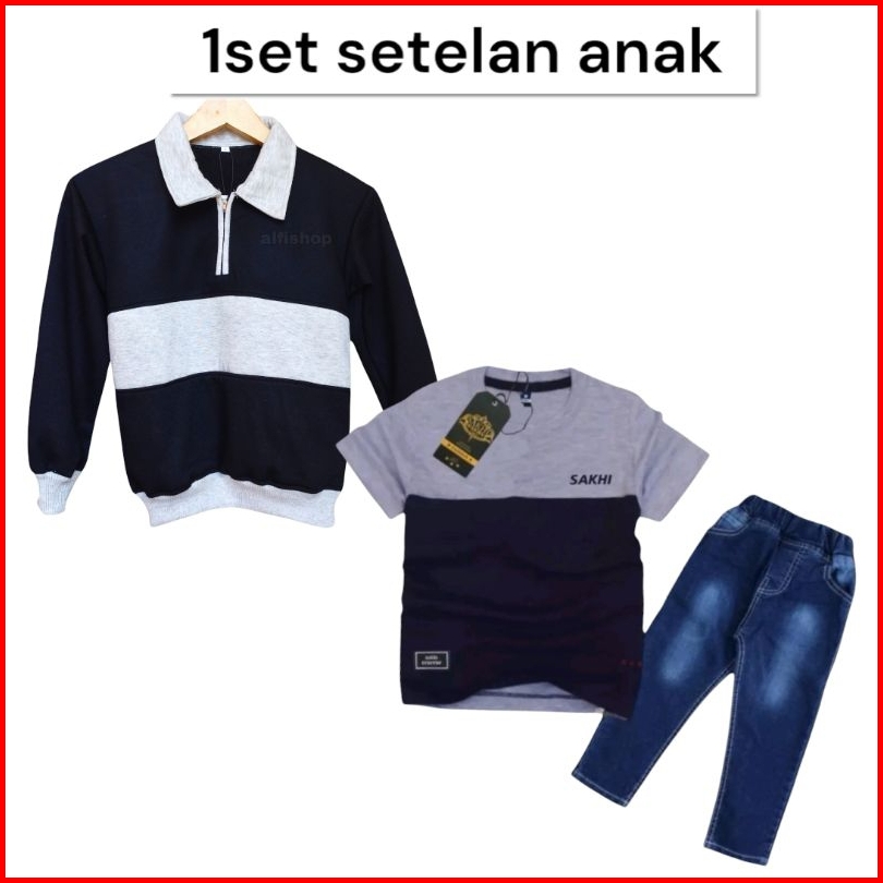 Pakaian Anak Laki-laki Satu Set Untuk Anak 1-12thn Switer Hitam Kaos Dan Celana Jeans Olnevy