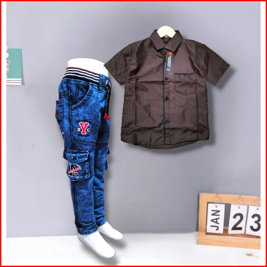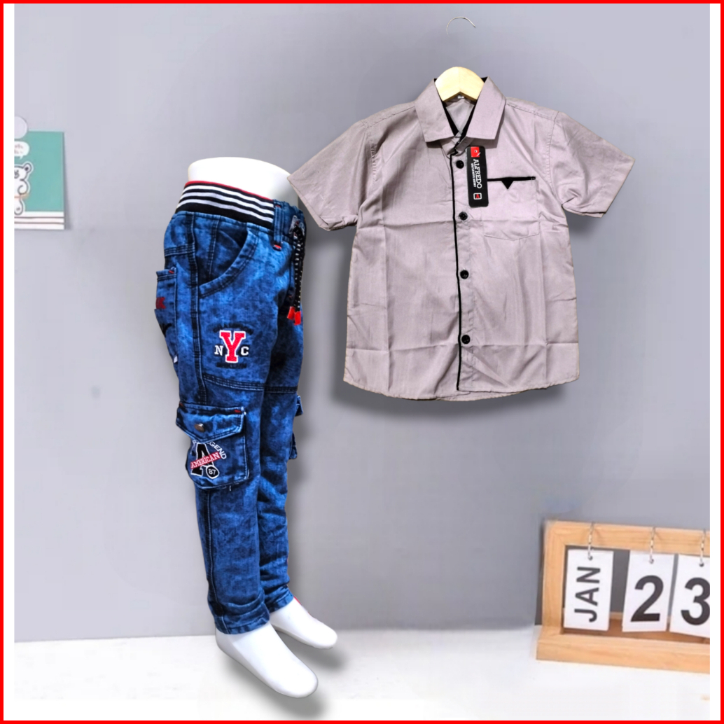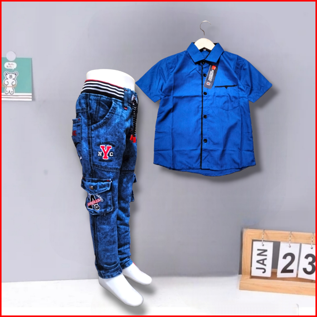 Setelan Jeans Panjang Anak Laki Laki Celana Cargo Dan Kemeja Polos Usia 2 Sampai 12 Tahun