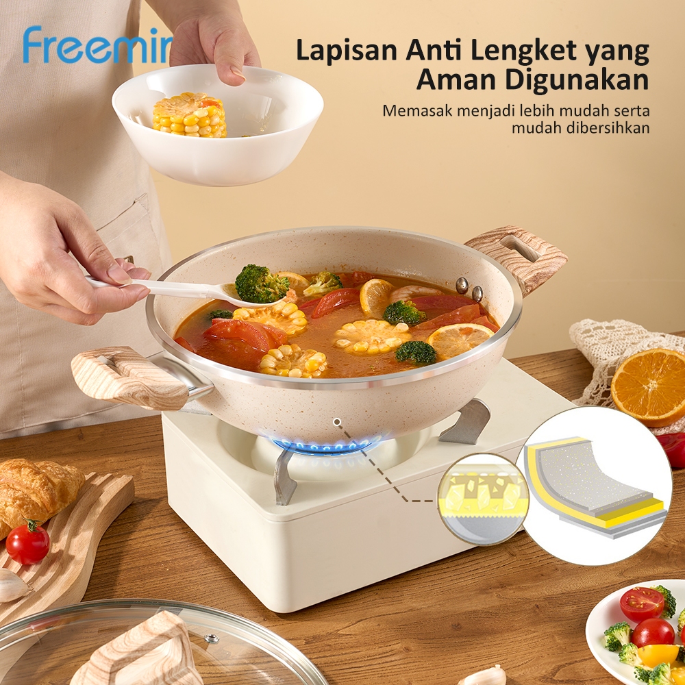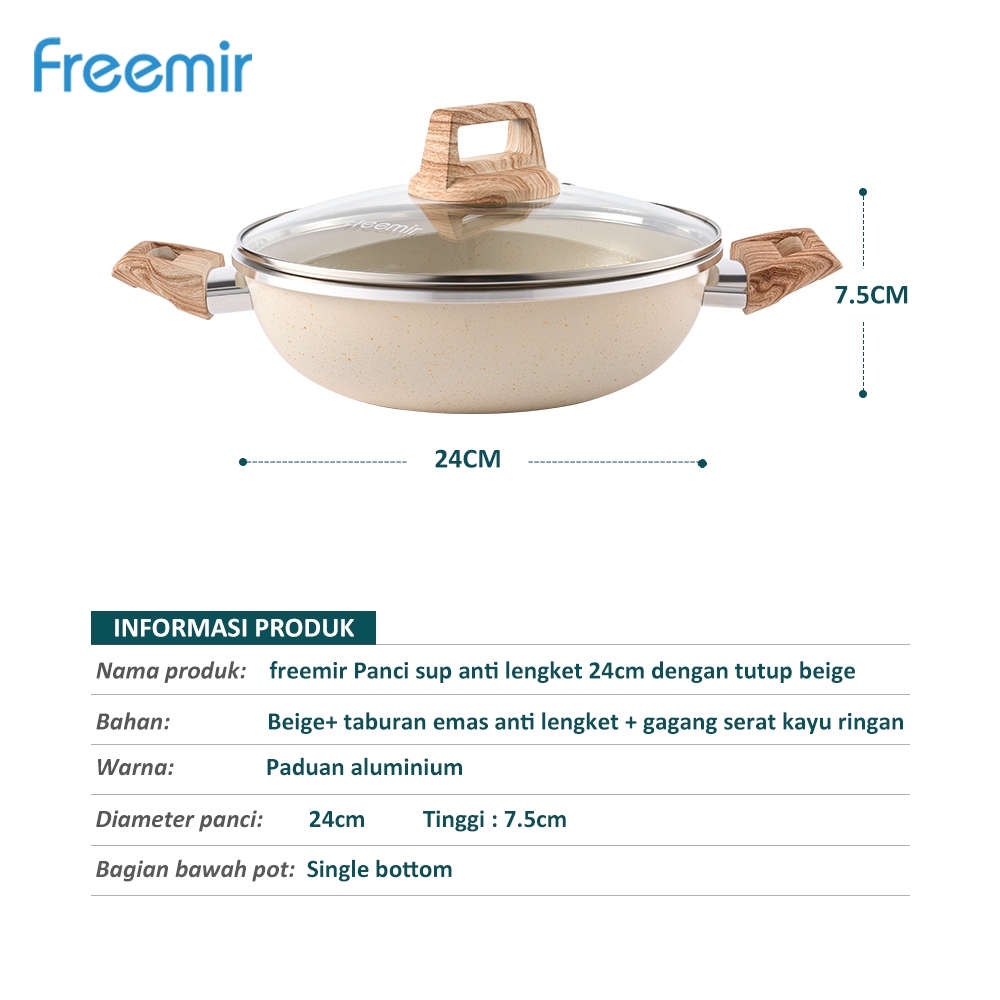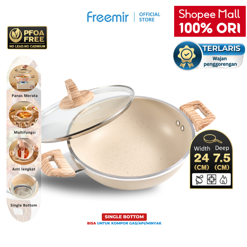 freemir Wajan Beige 24 cm Kedalaman 7.5 cm Dengan Tutup Kaca Anti Lengket Bahan Granit Terlaris
