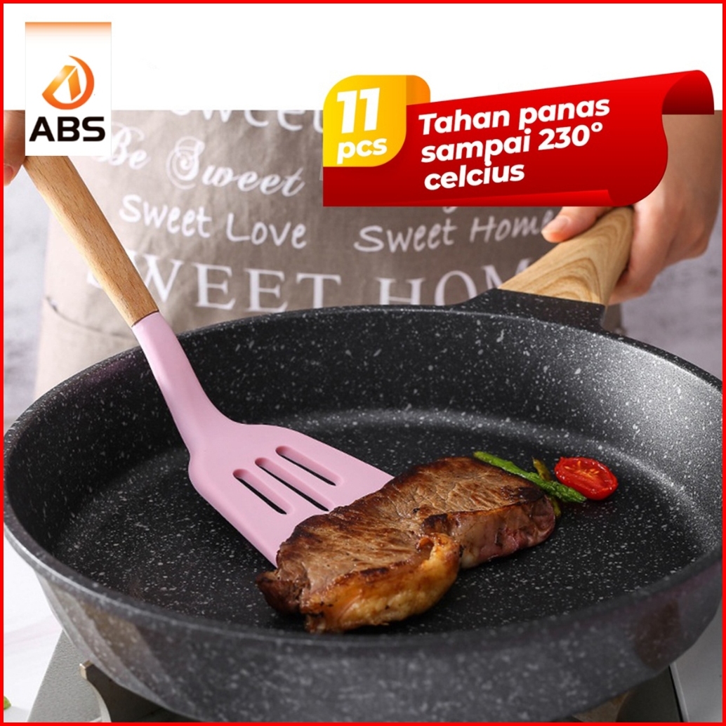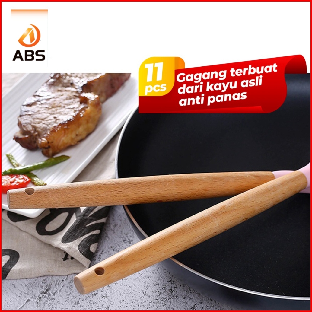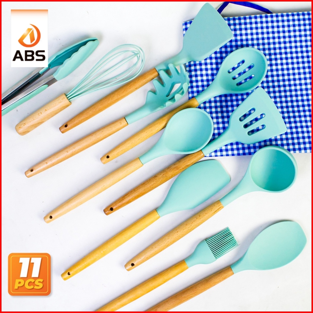 Abs Silicone Utensil 11pcs Wadah Spatula Peralatan Masak Sutil Pegangan Kayu Baking Set Alat Masak