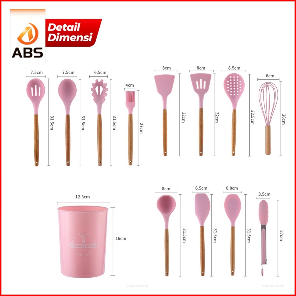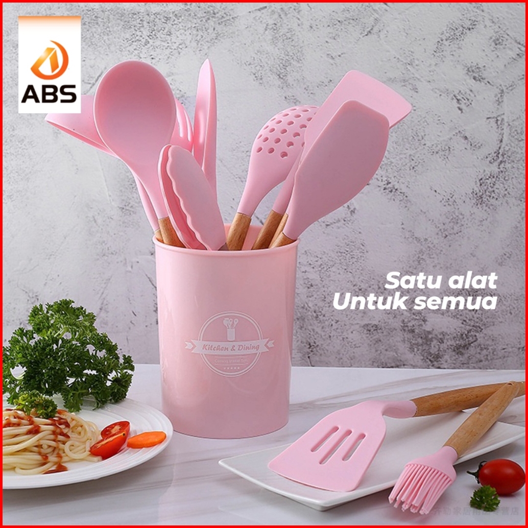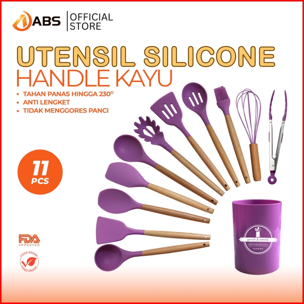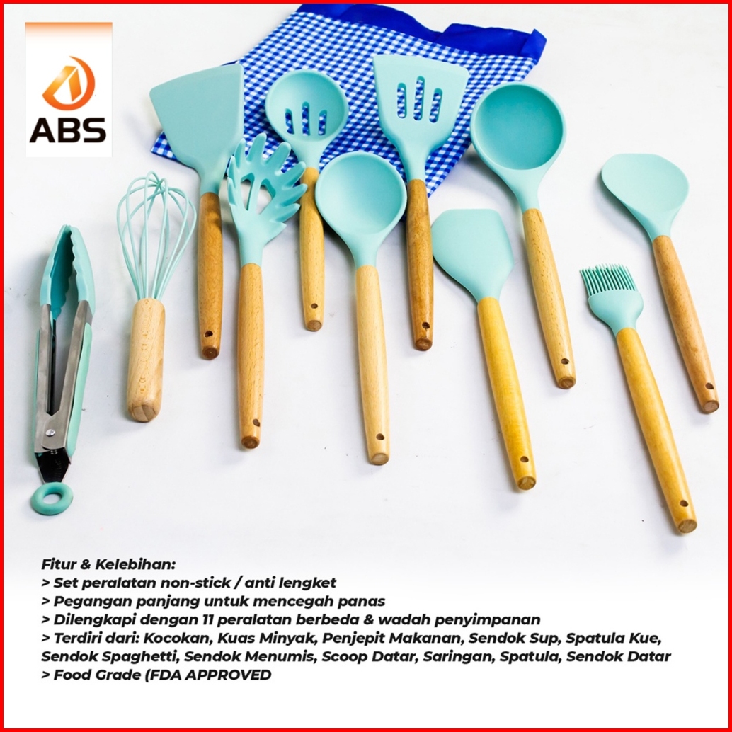 Abs Silicone Utensil 11pcs Wadah Spatula Peralatan Masak Sutil Pegangan Kayu Baking Set Alat Masak