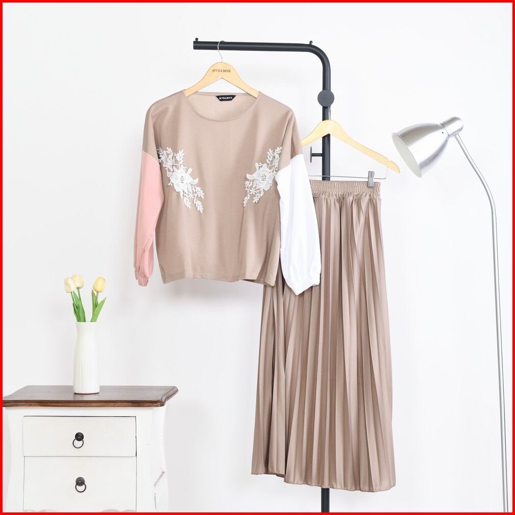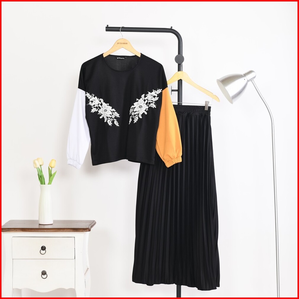 Mybamus Yisla Setelan Muslim Wanita Atasan Bordir Brukat Rok Plisket Kekinian