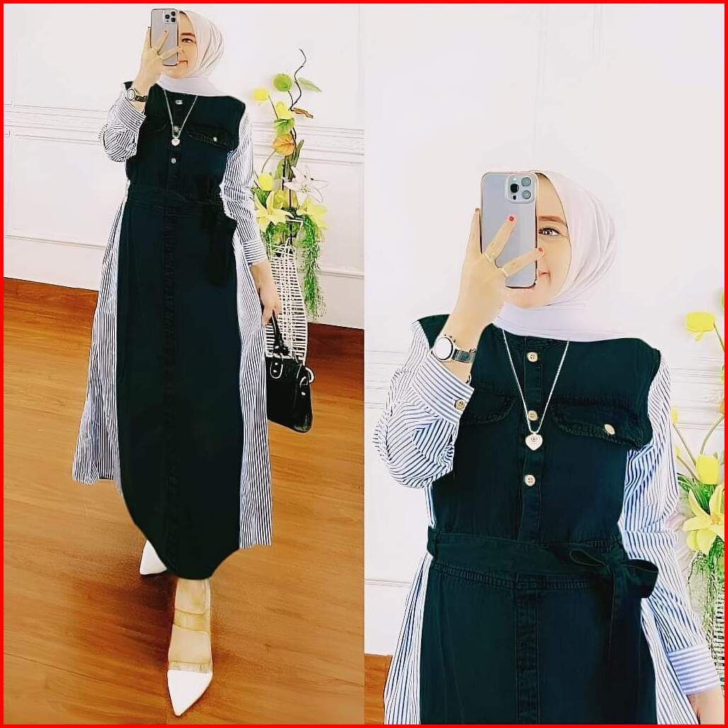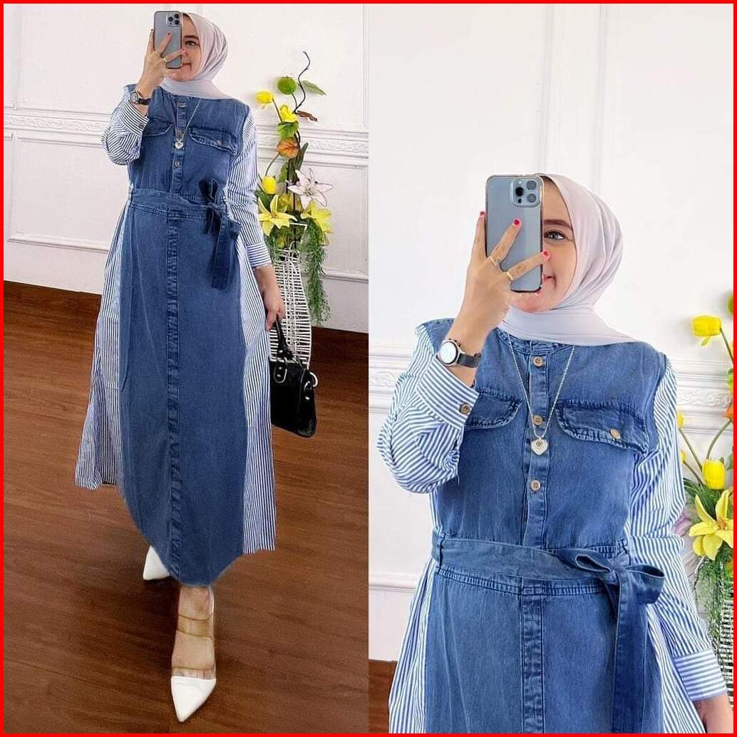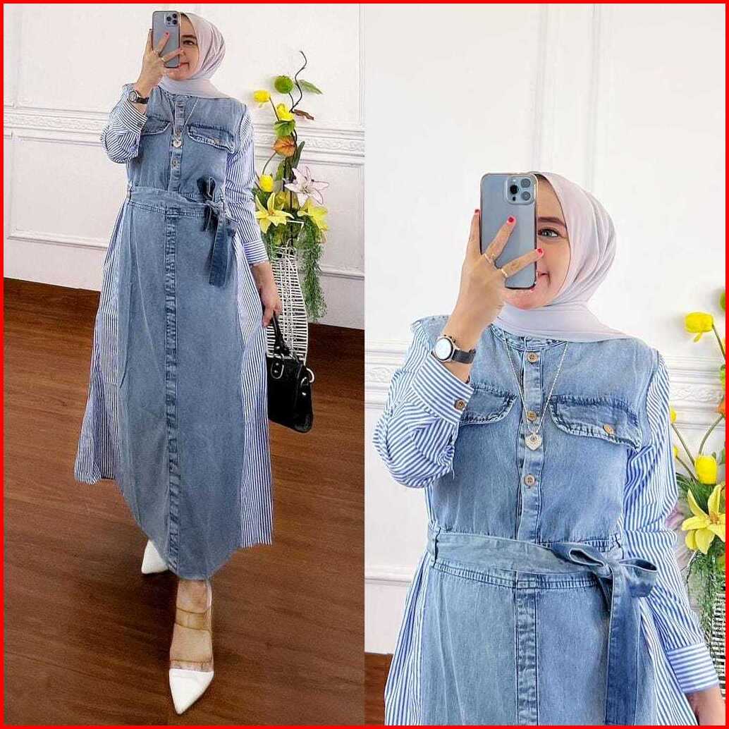 Gamis Jeans Kombinasi Salur Gamis Jeans Wanita Gamis Muslim Wanita Celline Dress Maxy Jeans
