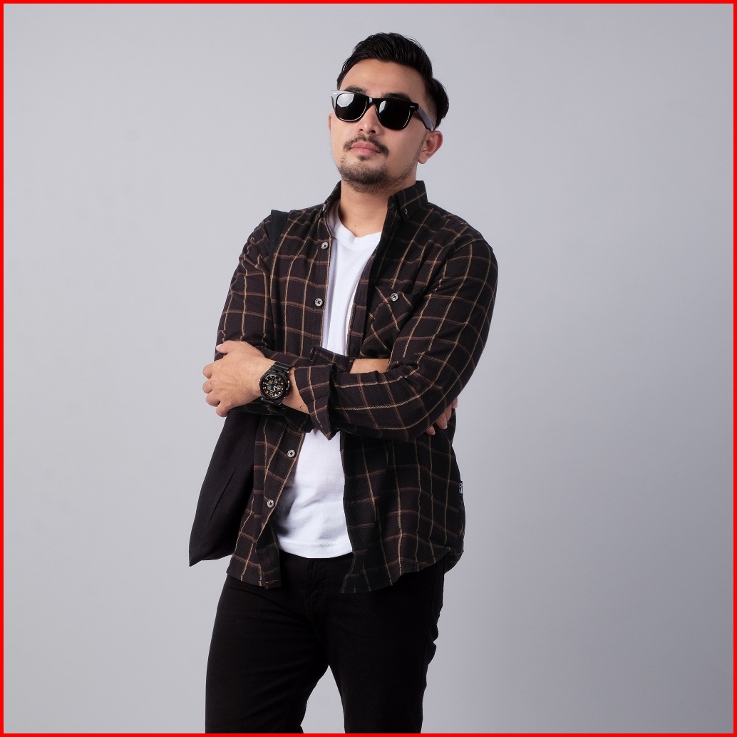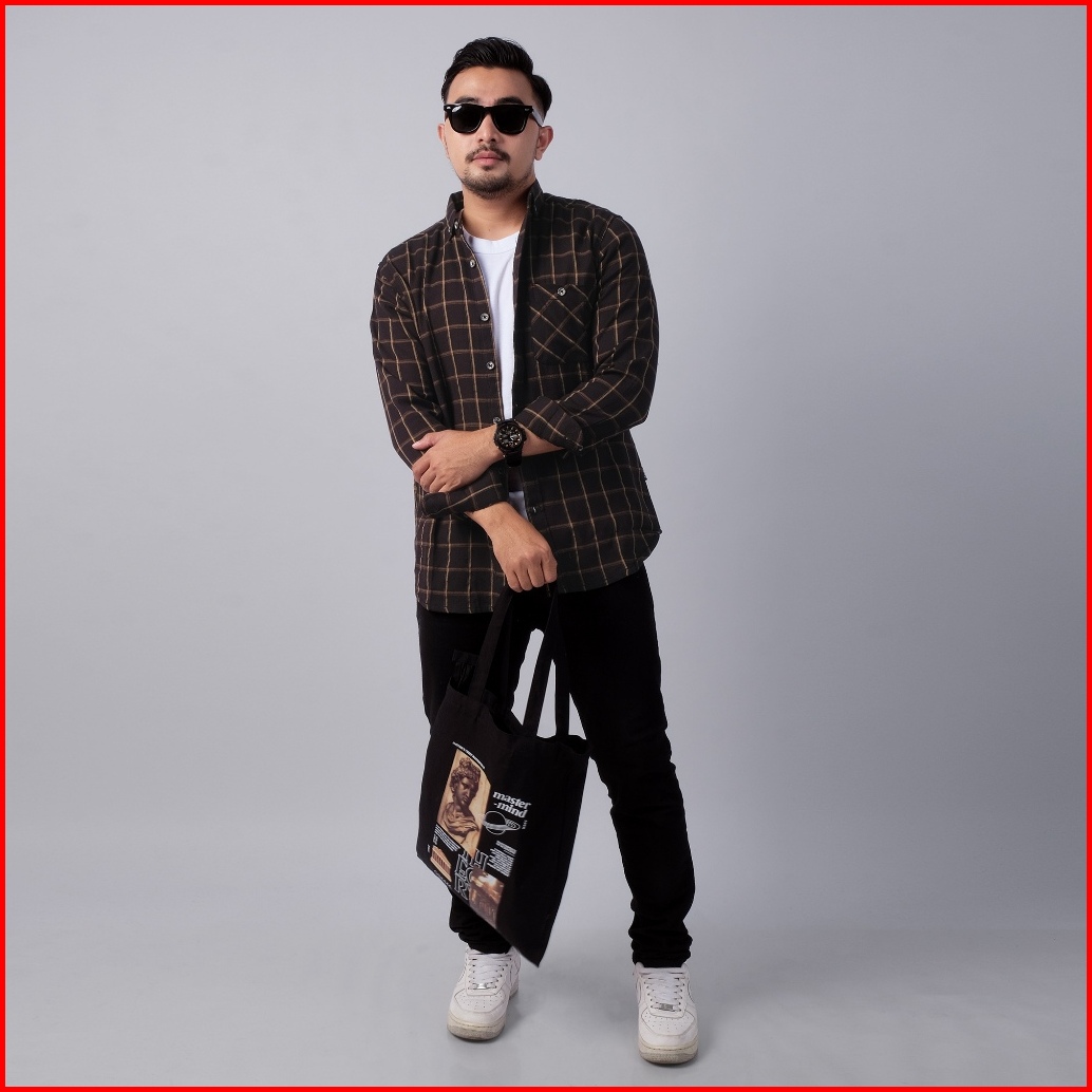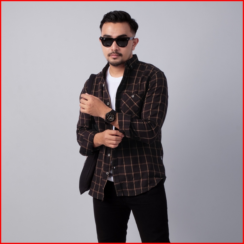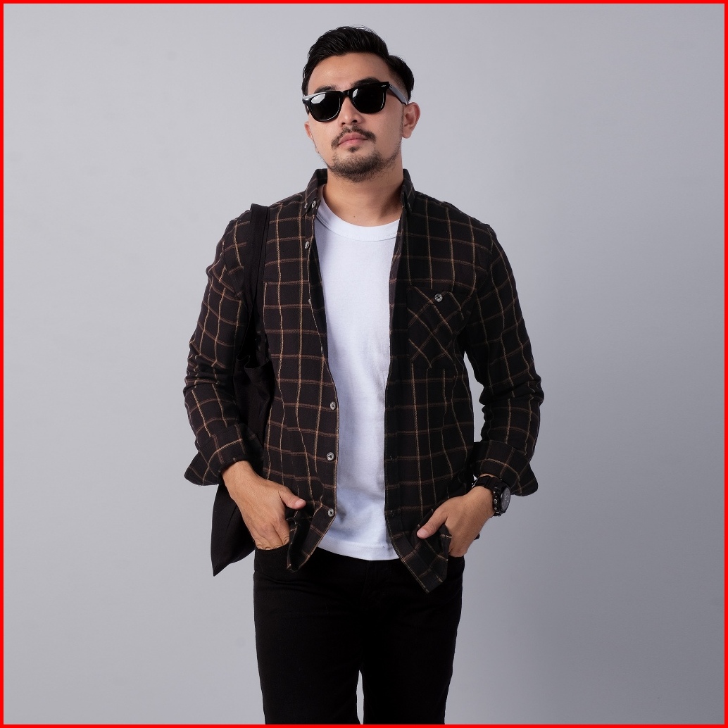 Dgm Fashion Kemeja Pria Flanel Premium Lengan Panjang Kotak-kotak Coklat Garis Kuning 1741